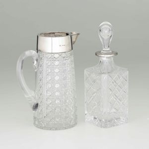 Bottiglia e brocca in vetro molato e argento, manifatture diverse del XX secolo