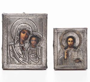 Vergine di Kazan e Cristo Pantocratore Icone su tavola. Riza in argento sbalzato [..]