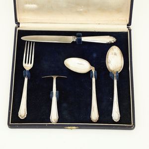 Set di posate per bambino entro custodia. Argento fuso e sagomato. Argenteria italiana [..]