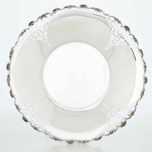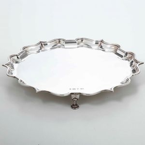 Salver in argento fuso e sagomato. Birmingham 1910, diametro cm 31. Etichetta cartacea [..]