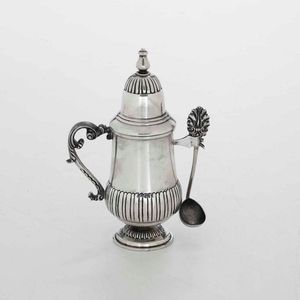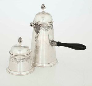 Cioccolatiera e scatola in argento fuso, sbalzato e cesellato. Argenteria milanese [..]