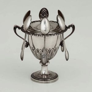 Zuccheriera con sei cucchiaini in argento e tre saliere antiche (mancanze), vari [..]