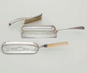 Lotto di due raccogli briciole e una spazzola da tavola in argento. Inghilterra, [..]