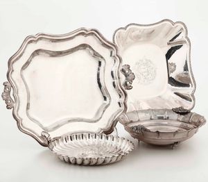Due vassoi in argento e uno in metallo argentato. Varie manifatture del XX secolo