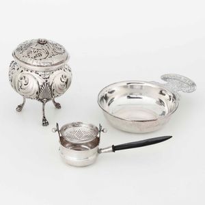 Insieme di filtro, zuccheriera e taste-vin in argento. Varie manifatture italiane [..]