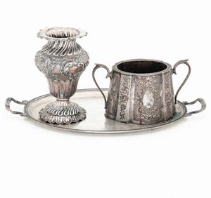 Lotto composto da un vassoio, un vaso e una zuccheriera in argento. Varie manifatture [..]