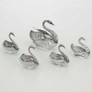 Lotto di cinque salini a guisa di cigno in argento e cristallo. Argenteria toscana [..]