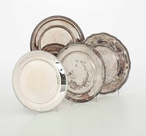 Lotto di quattro piatti in argento. Varie manifatture italiane del XX secolo