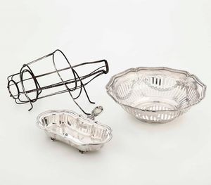Lotto composto da una cestina, un porta bottiglie e vassoietto con manico in argento. [..]