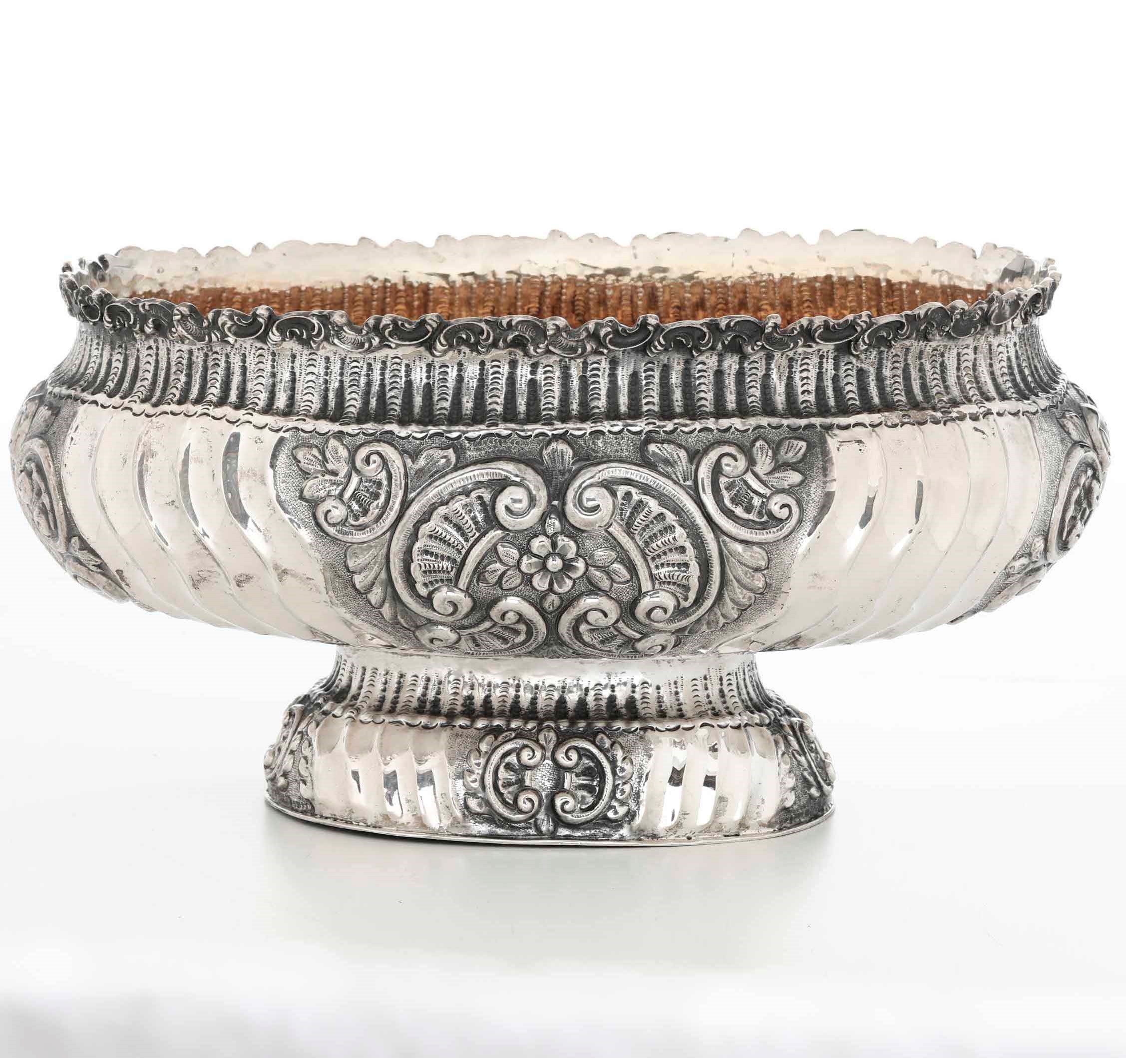 Bacile in argento fuso, sbalzato e cesellato, interno dorato. Argenteria artistica [..]