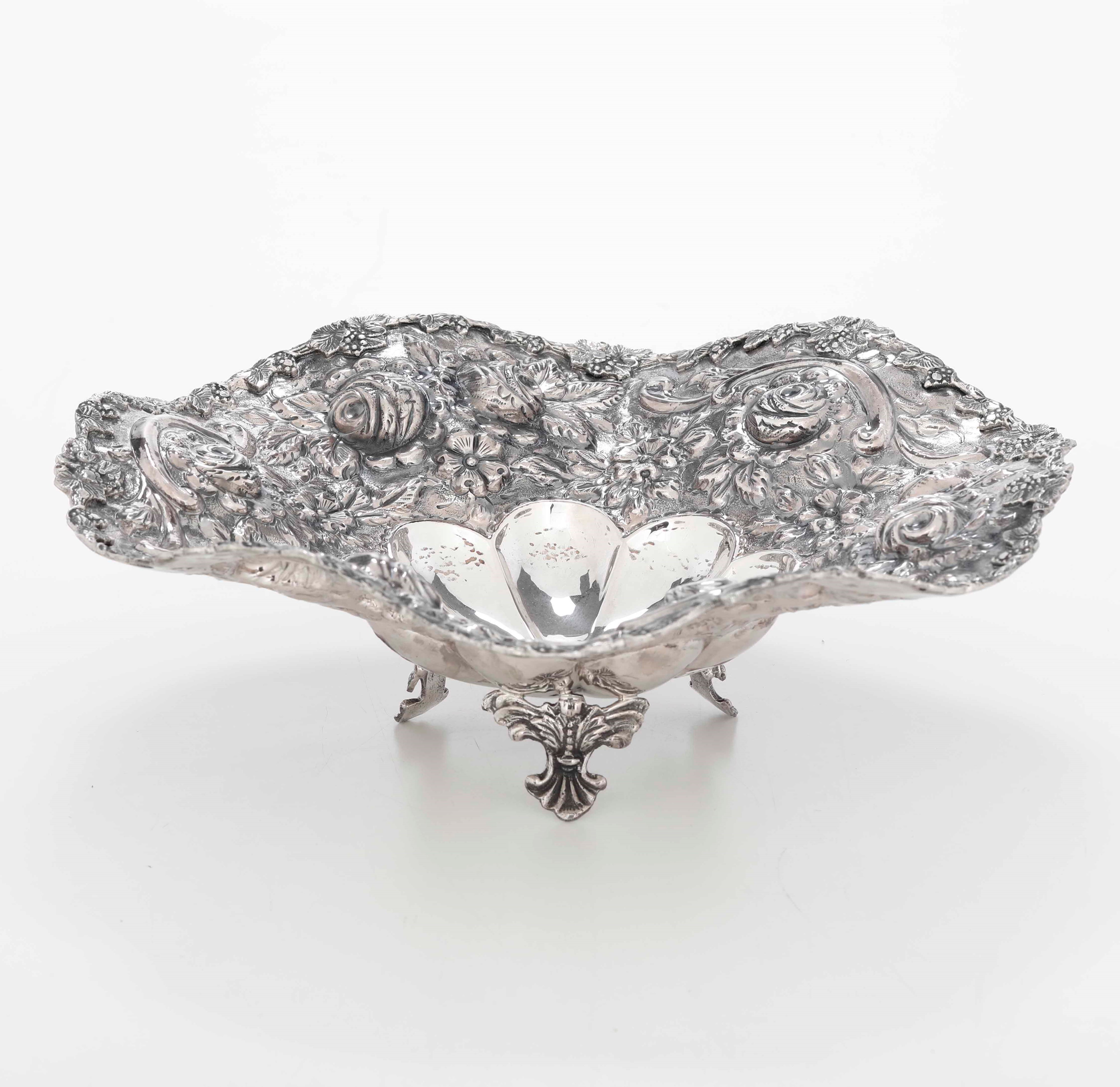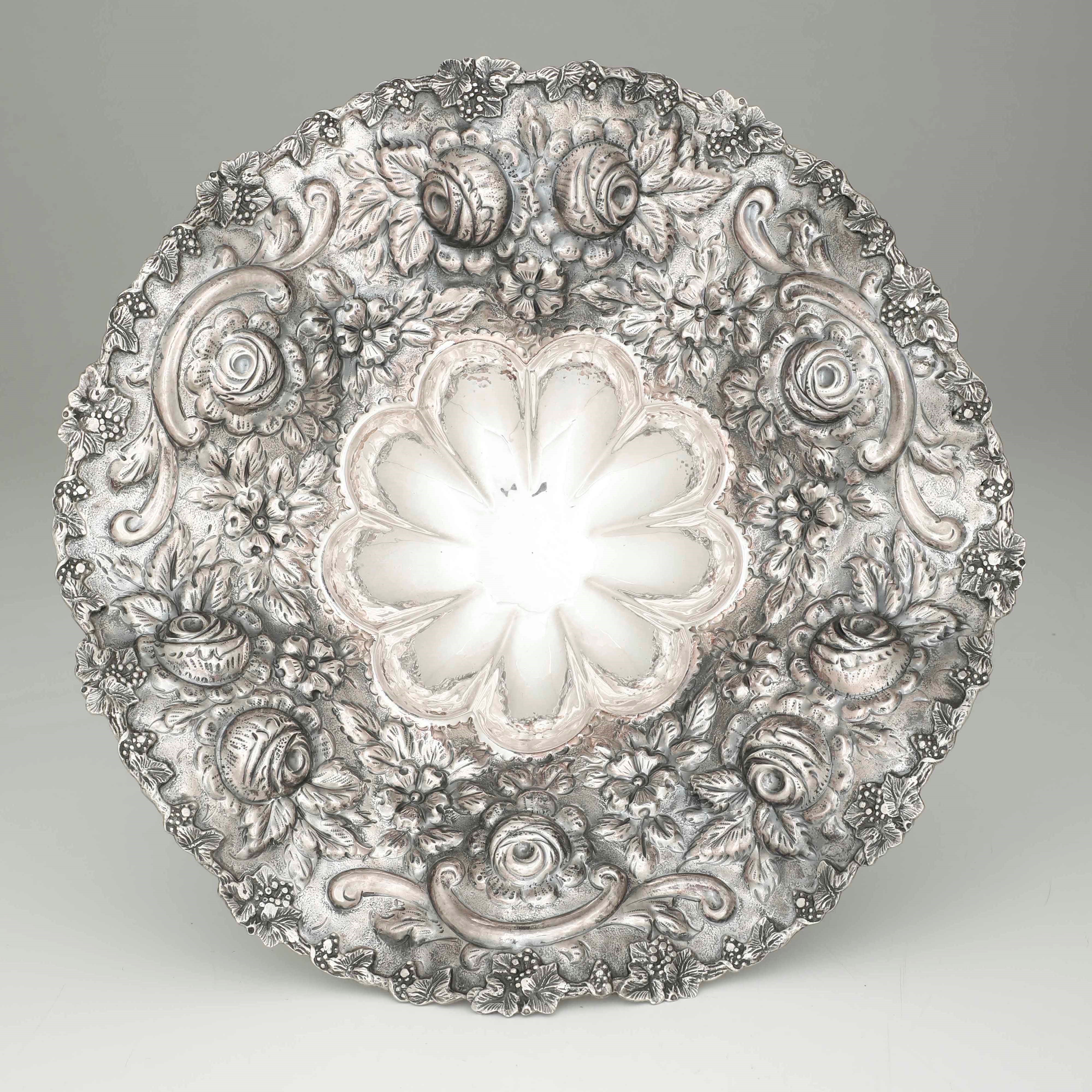 Centrotavola in argento fuso, sagomato e cesellato, con bordo mistillineo sbalzato [..]