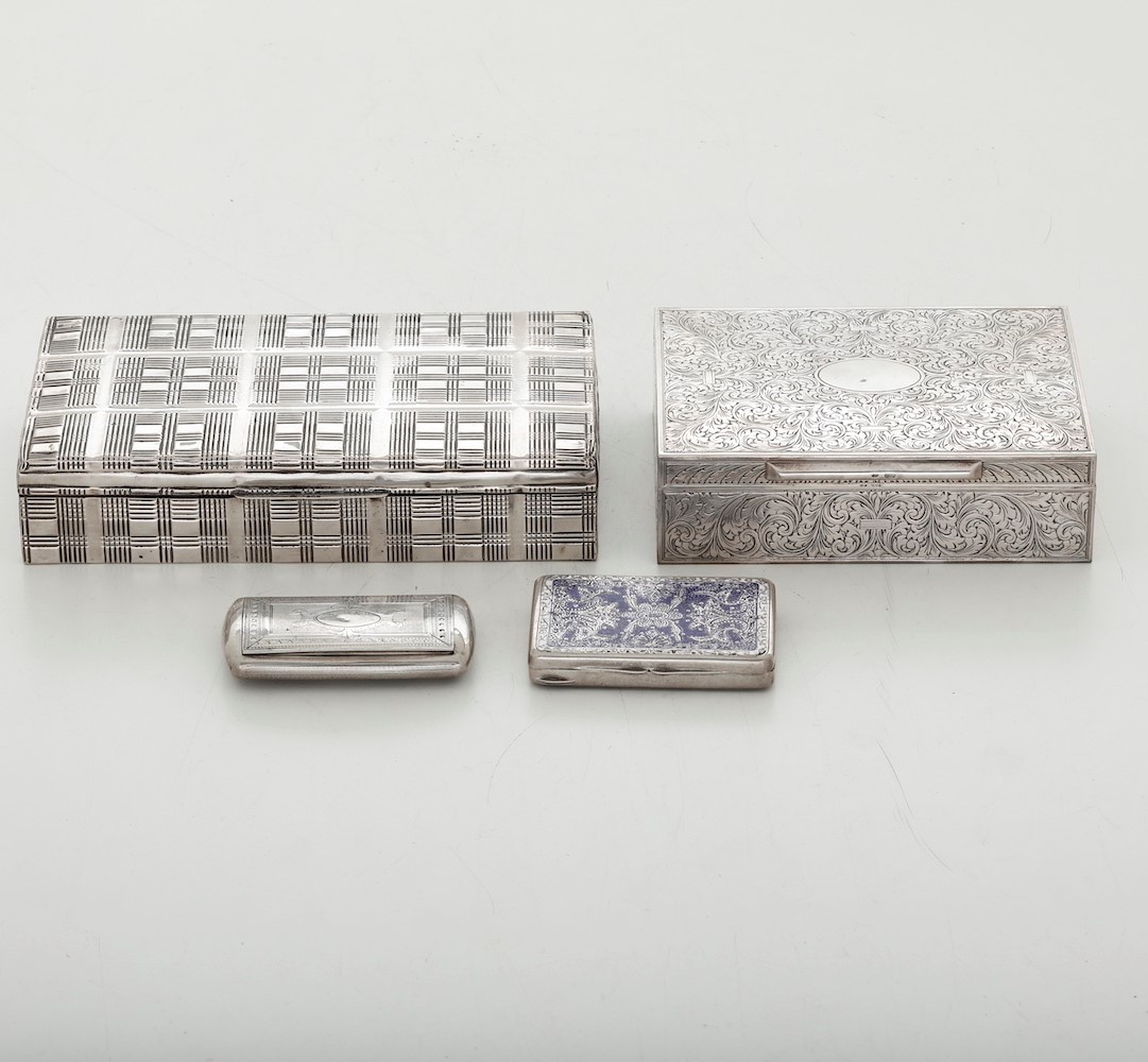 Due scatole portasigarette e due tabacchiere in argento, varie manifatture del XX [..]