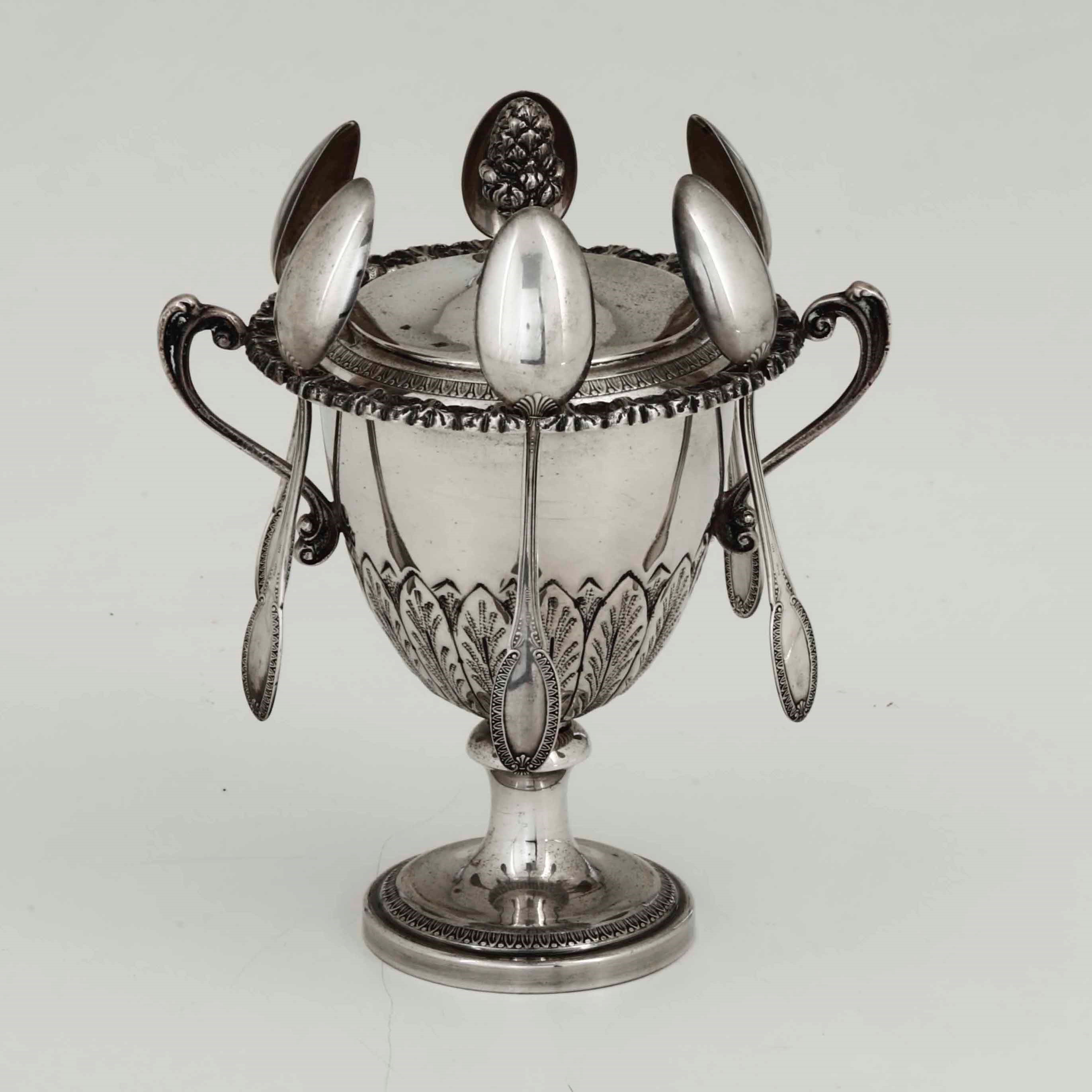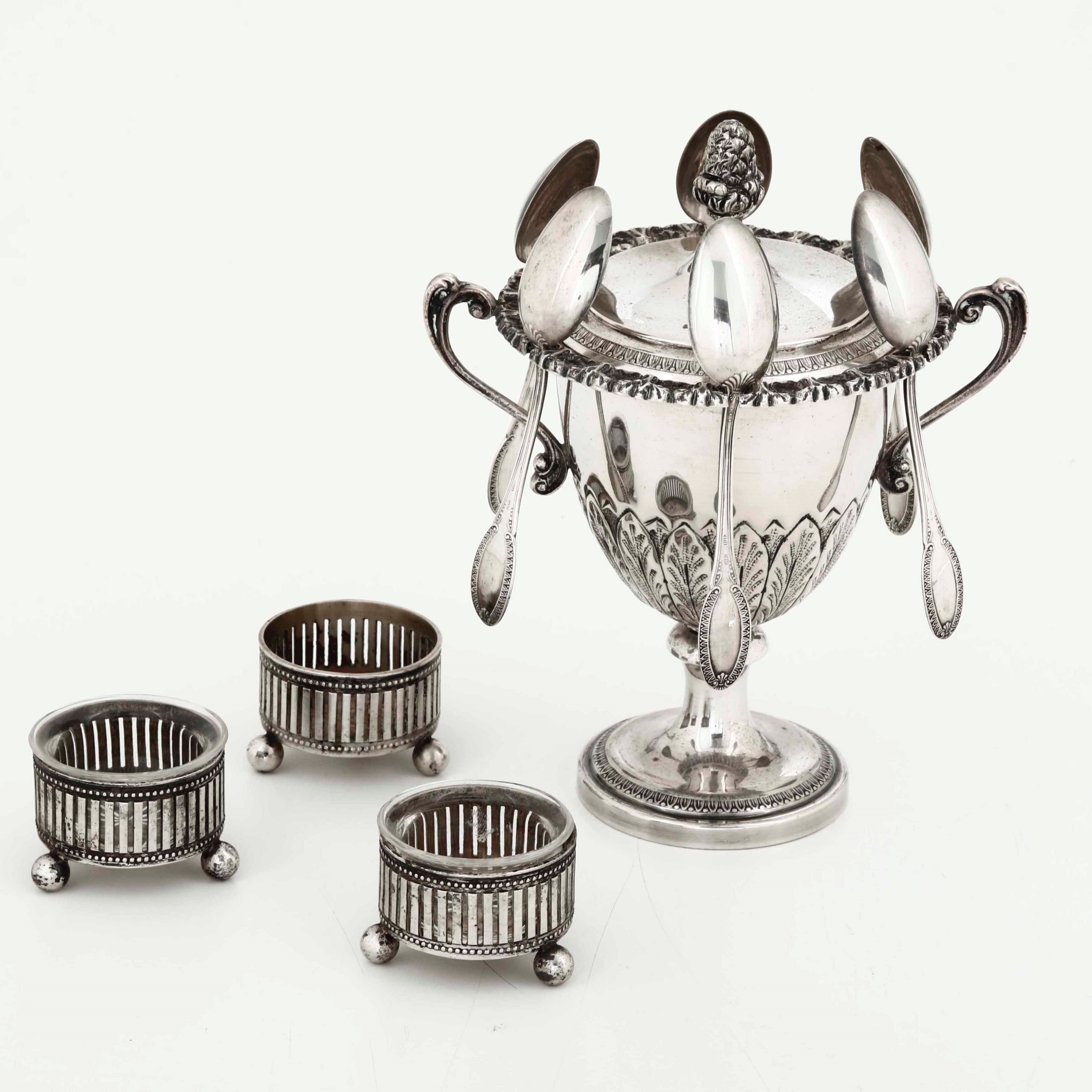 Zuccheriera con sei cucchiaini in argento e tre saliere antiche (mancanze), vari [..]