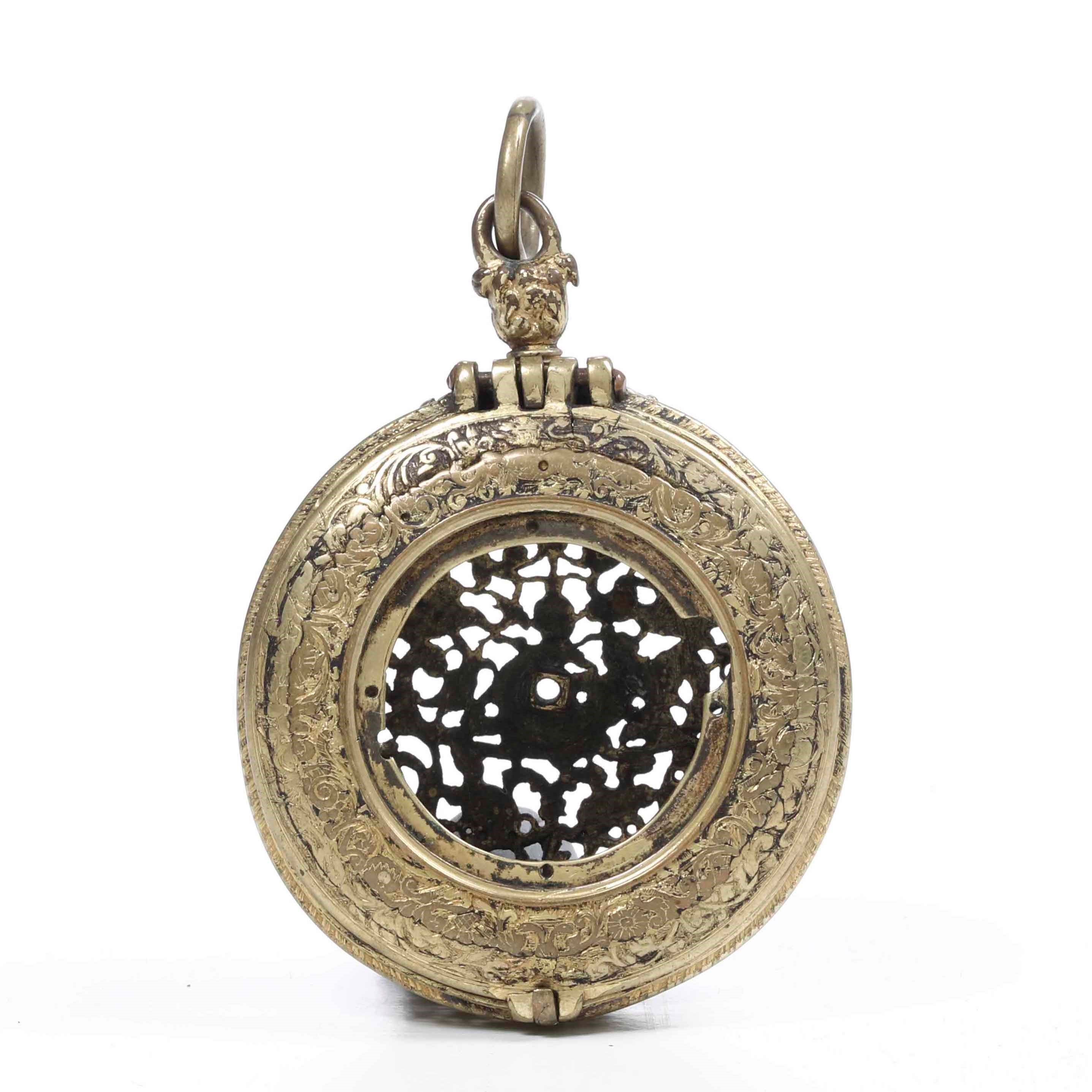 Cassa portaorologio a pendente in metallo dorato e traforato. XVI-XVII secolo