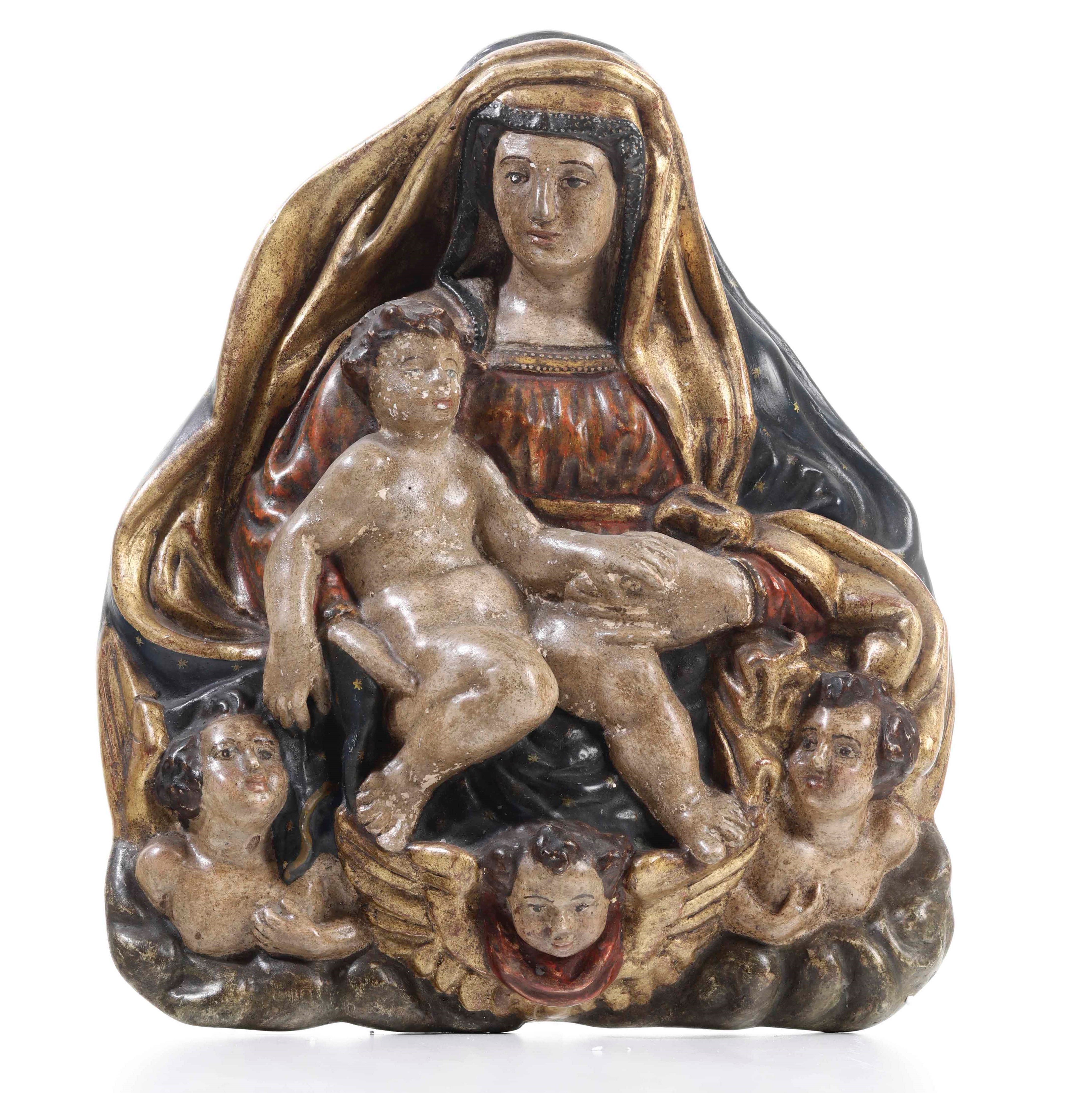 Gruppo raffigurante Madonna con Bambino e angeli. Papier-machè dipinto e legno. [..]