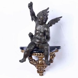 Angioletto in bronzo su base in legno intagliato e dorato. XX secolo