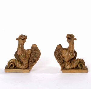 Coppia di draghi fermalibro in terracotta patinata. XIX-XX secolo