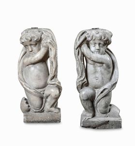 Coppia di putti genuflessi. Marmo bardiglio. Arte barocca italiana del XVII seco [..]