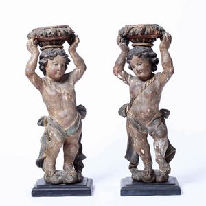 Coppia di putti in legno scolpito e dipinto. Arte barocca del XVII secolo