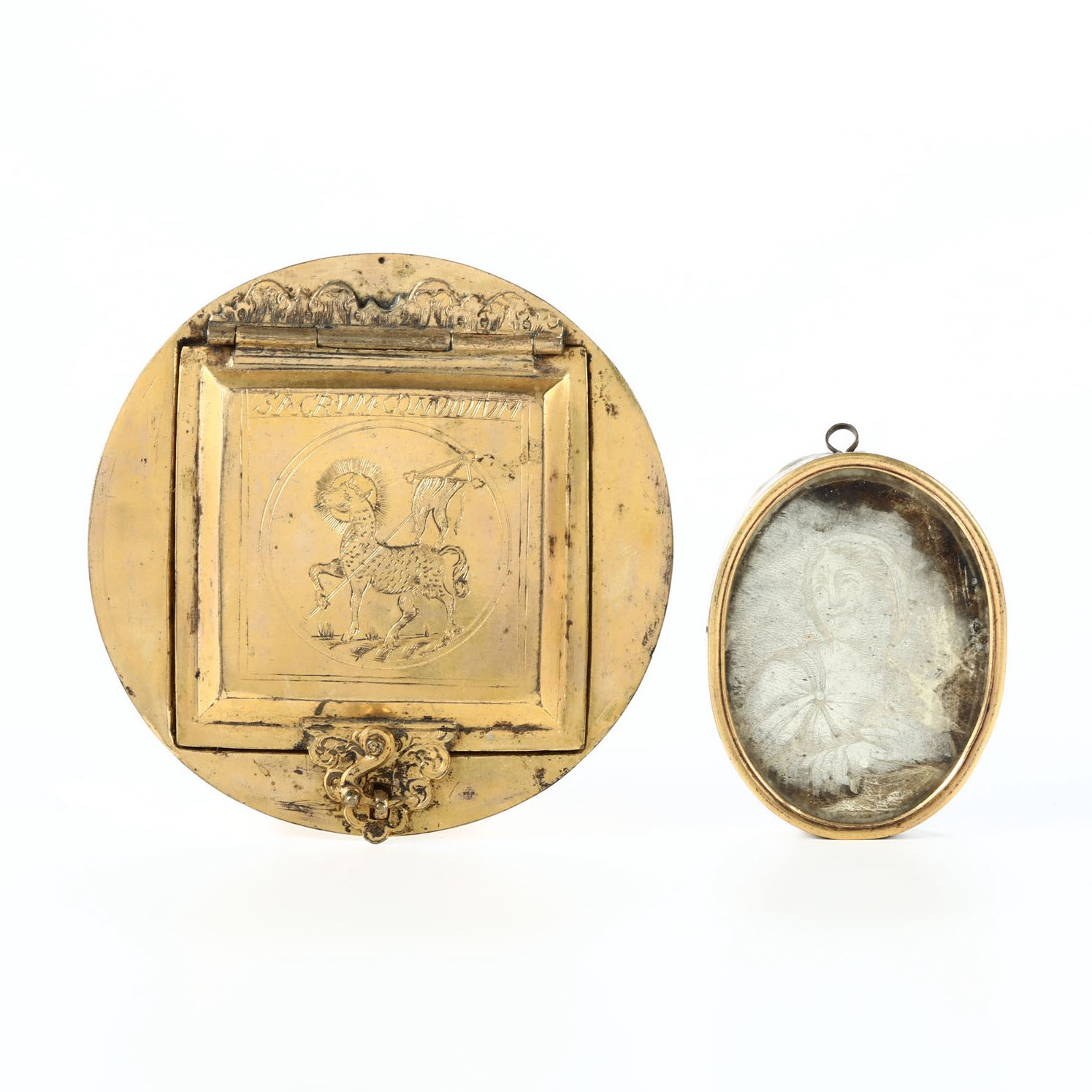 Teca per il Santissimo in rame cesellato e dorato e Medaglione ovale in rame dorato [..]