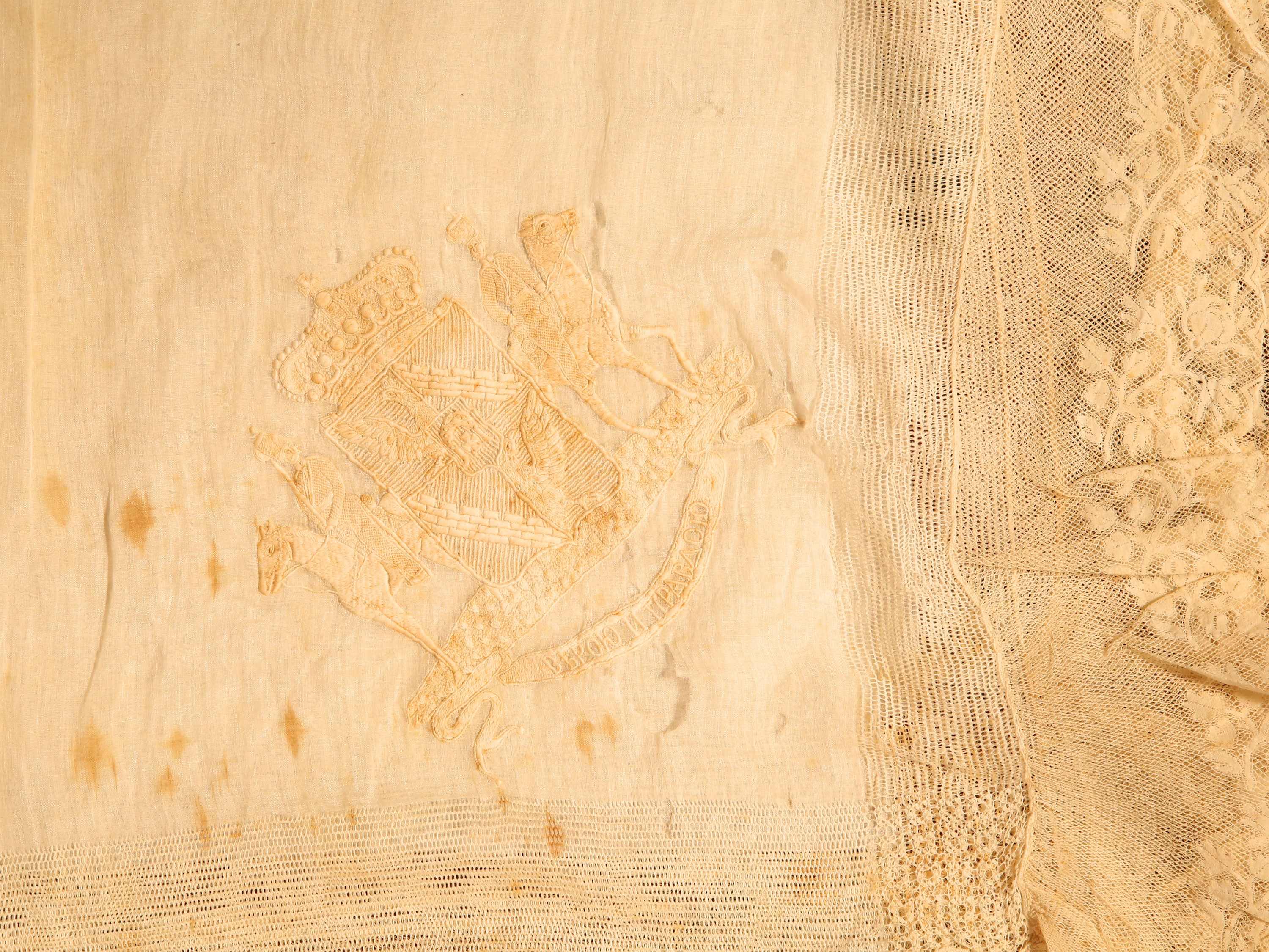Russia, XIX/XX secolo finemente ricamato con stemma nobiliare, bordo in merletto, difetti