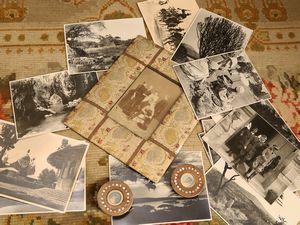 cornice cm 36x28 (17) inizio del XX secolo una cornice rivestita in tessuto, due miniature ed una serie di 18 [..]