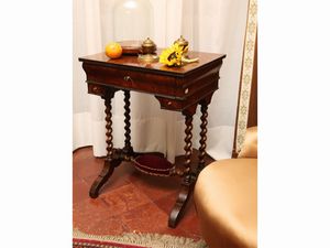 h cm 70x54x42 metà del XIX secolo piano intarsiato con doppia filettatura, bordi a guilloché, doppi sostegni [..]