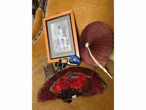 fotografia cm 19x11 (9) XIX/XX secolo tra cui due ventagli, un paio di forbicine da ricamo ed una fotografia [..]