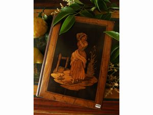 h cm 31x23x7 Sorrento, fine del XIX secolo legatura in legno intarsiato con figura femminile, alcuni difetti