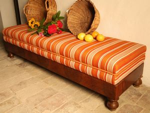 h cm 43x182x55 metà del XIX secolo rivestito in filaticcio rigato nei toni dell'arancio, su piedi a cipolla