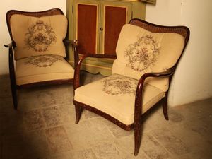 h cm 75x62x67 XX secolo schienale in paglia di Vienna, seduta rivestita in tessuto floreale, corredate di cuscini, [..]