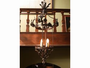 lanterna h cm 100, catena lungh cm 240 circa inizio del XX secolo decorata con motivi floreali, mancante dei [..]