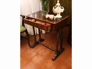 h cm 78x71x68 XIX secolo un tavolino in ciliegio con piano filettato e cassetto sottostante, gambe a sciabola [..]