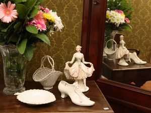 dama h cm 25 (4) inizio del XX secolo composto da una dama ed una scarpetta in porcellana, un cestino in biscuit [..]
