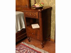 h cm 82x48x40 metà del XIX secolo piano e cassetto intarsiato con volute e girali in legno di frutto, piedi a [..]