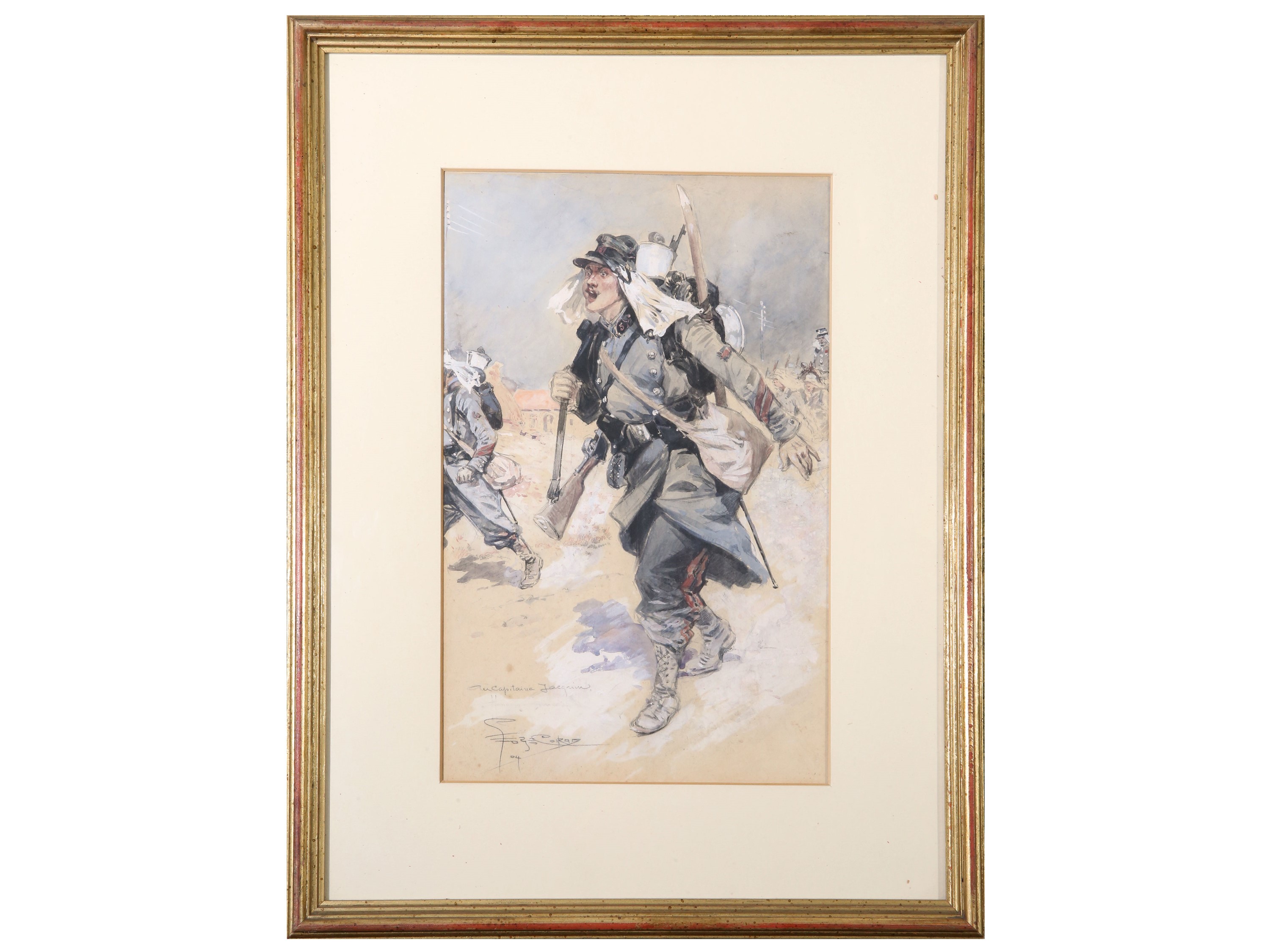 inizio del XX secolo acquerello su carta applicata a cartoncino, firmato e dedicato al Capitano Jacquin, in cornice, reca ingiallimento del foglio e tracce di foxing