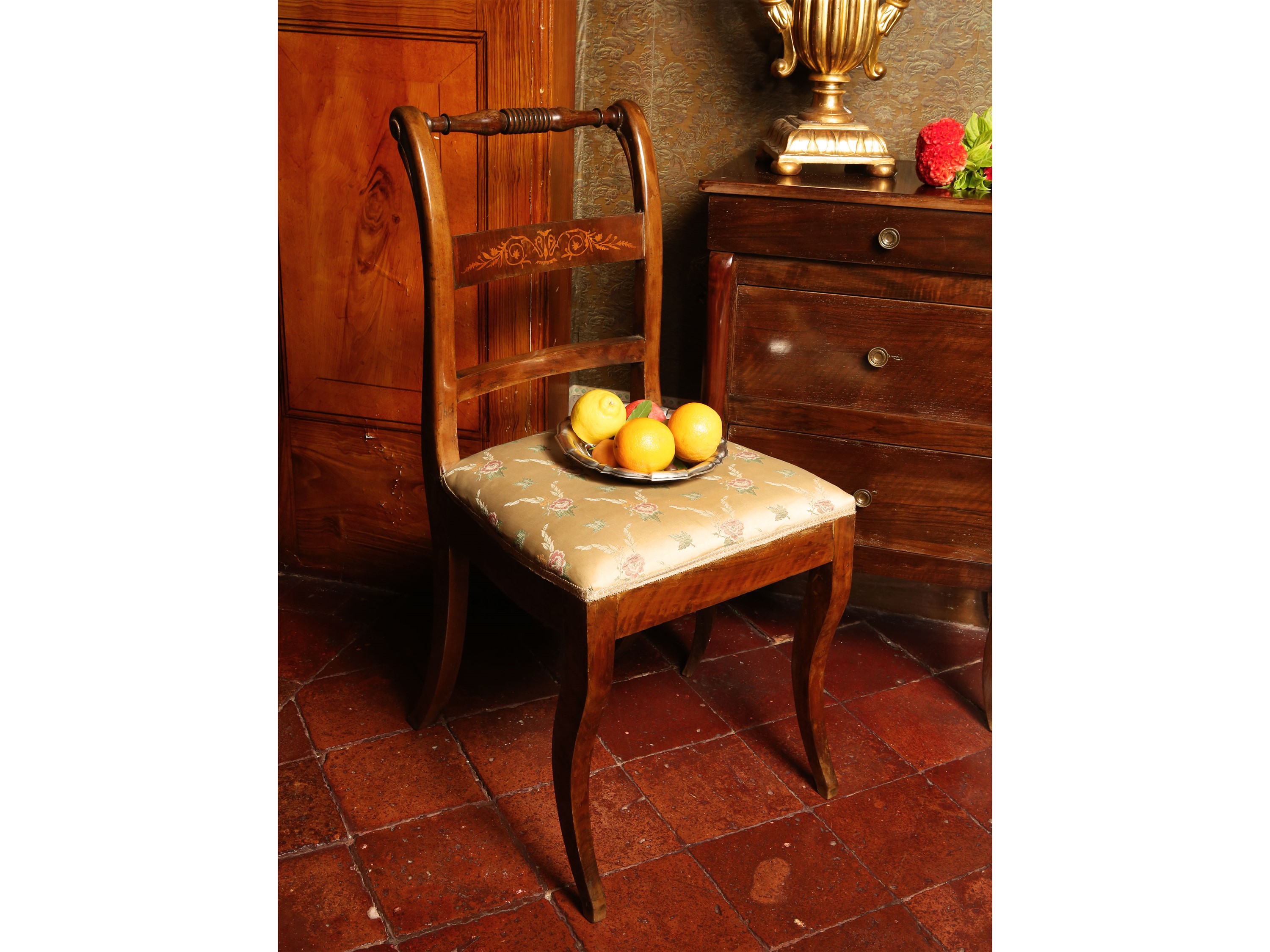 prima metà del XIX secolo schienale con triplice cartella, una delle quali intarsiata in legno di frutto, sedile rivestito in raso floreale nei toni del beige