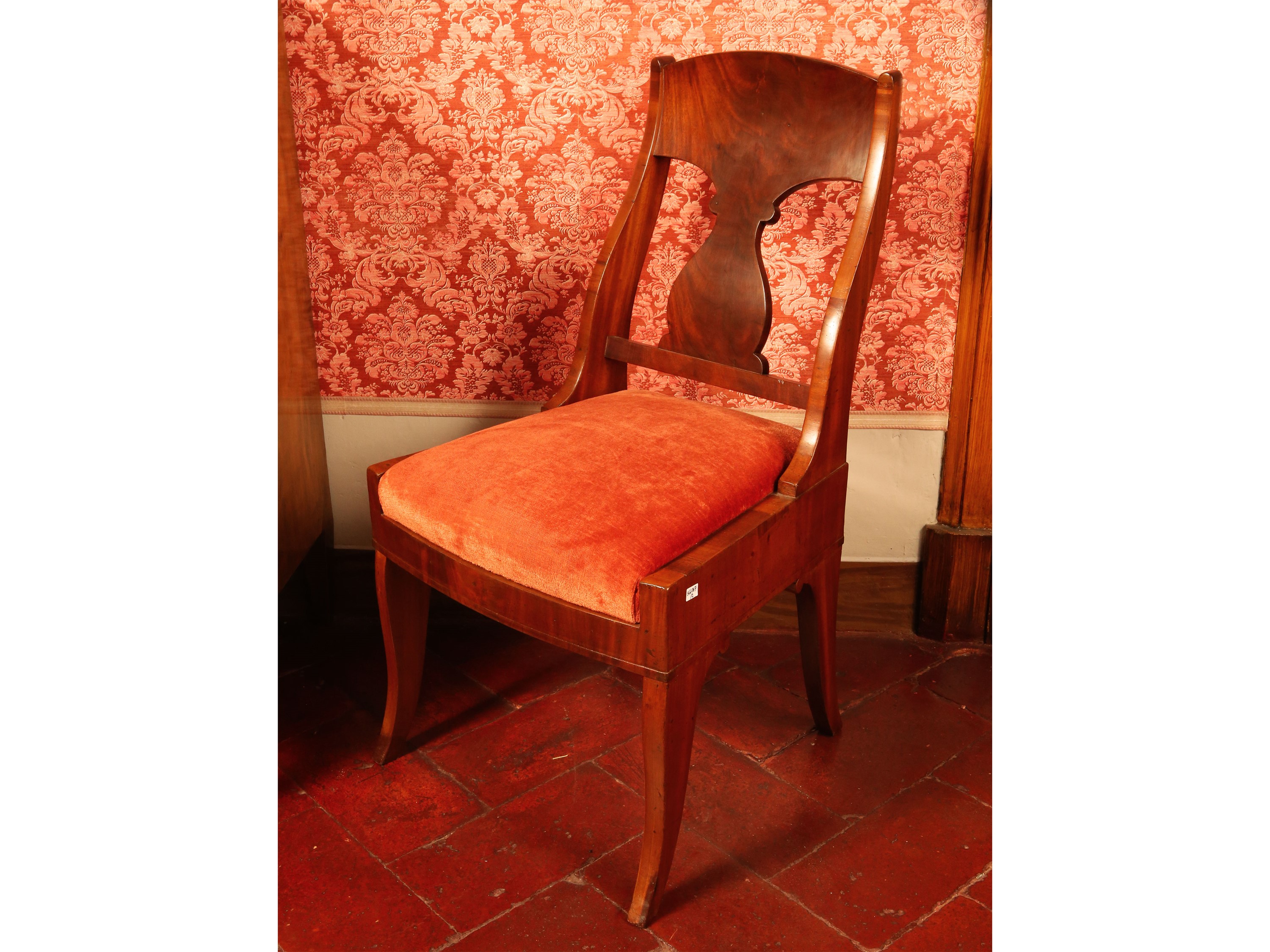 Emilia, prima metà del XIX secolo schienale con cartella a T, gambe a sciabola, sedile rivestito in velluto color becco d'oca
