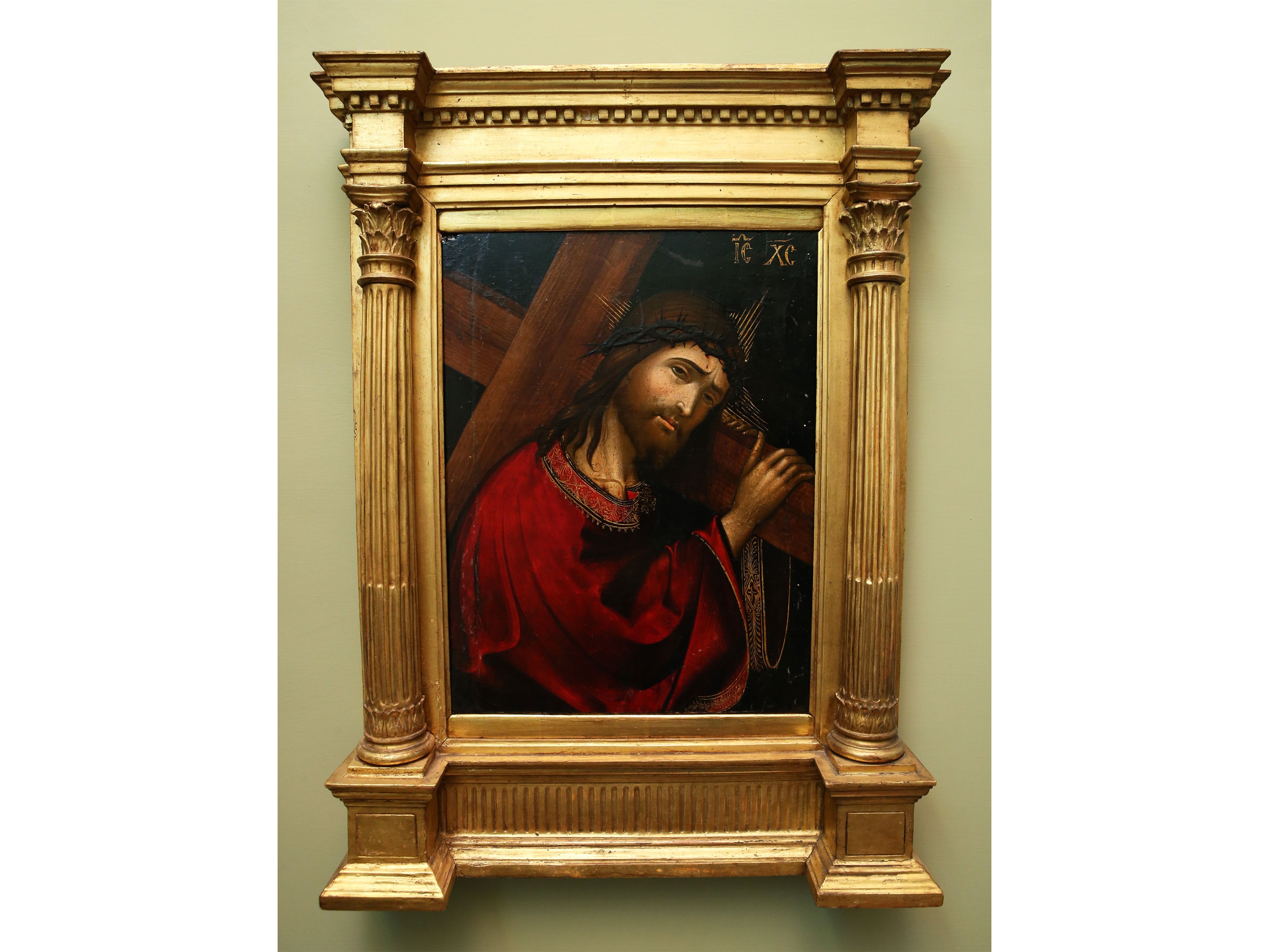 XIX secolo olio su tavoletta, in cornice a tabernacolo in legno intagliato e dorato, alcuni difetti