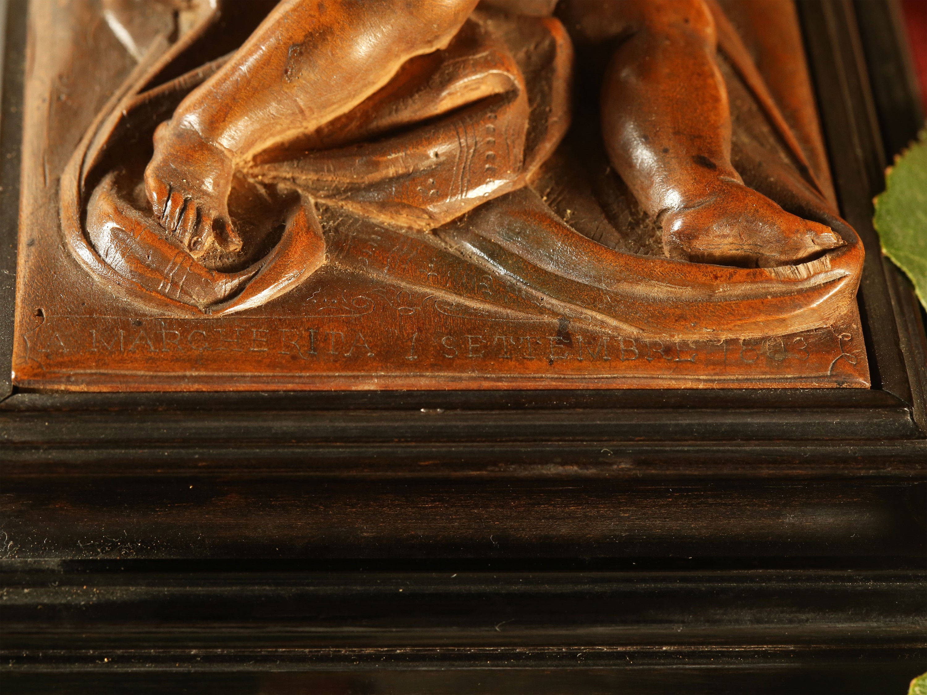 1803 piccola scultura in legno di bosso, su base ebanizzata, ispirata ad un modello di Francois Duquesnoy, reca iscrizione Annina Grisaldi del Taja