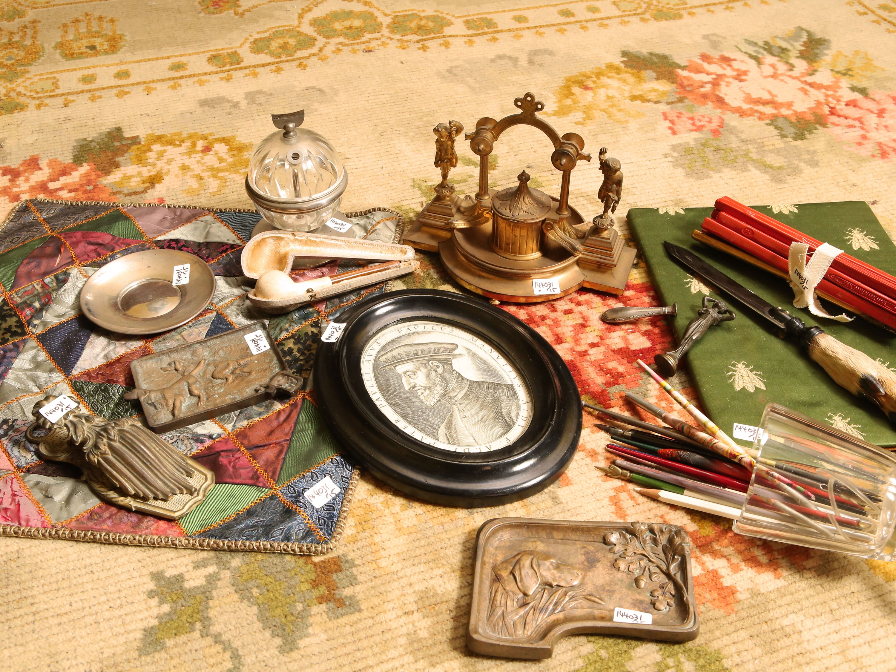 inizio del XX secolo tra cui un calamaio in bronzo dorato realizzato come un pozzo, un porta spago in cristallo, una pinza fermacarte, una pipa e due sigilli di gusto Liberty