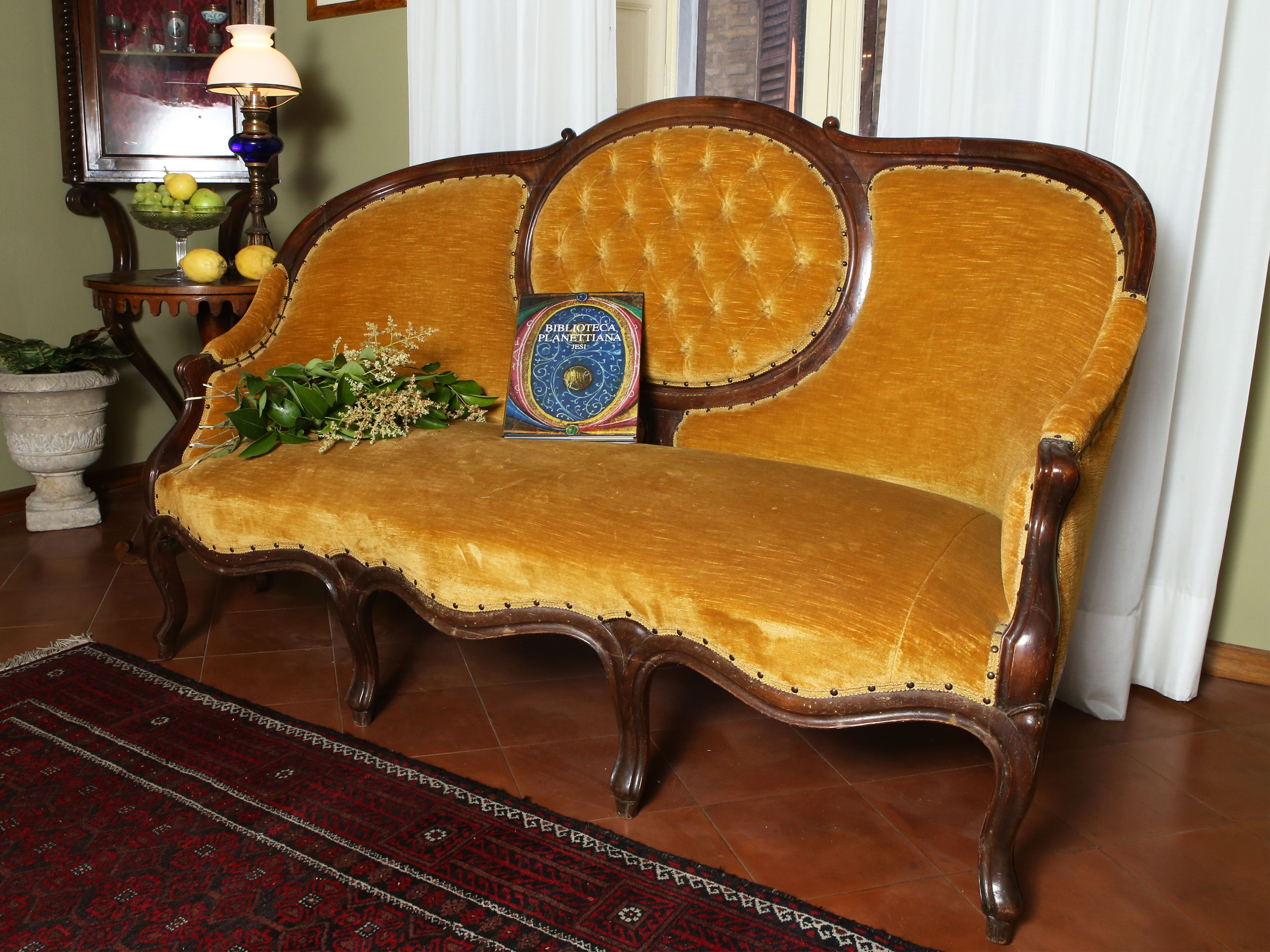 seconda metà del XIX secolo schienale lievemente mosso, centrato da rosone capitonné, imbottito e rivestito in velluto giallo oro