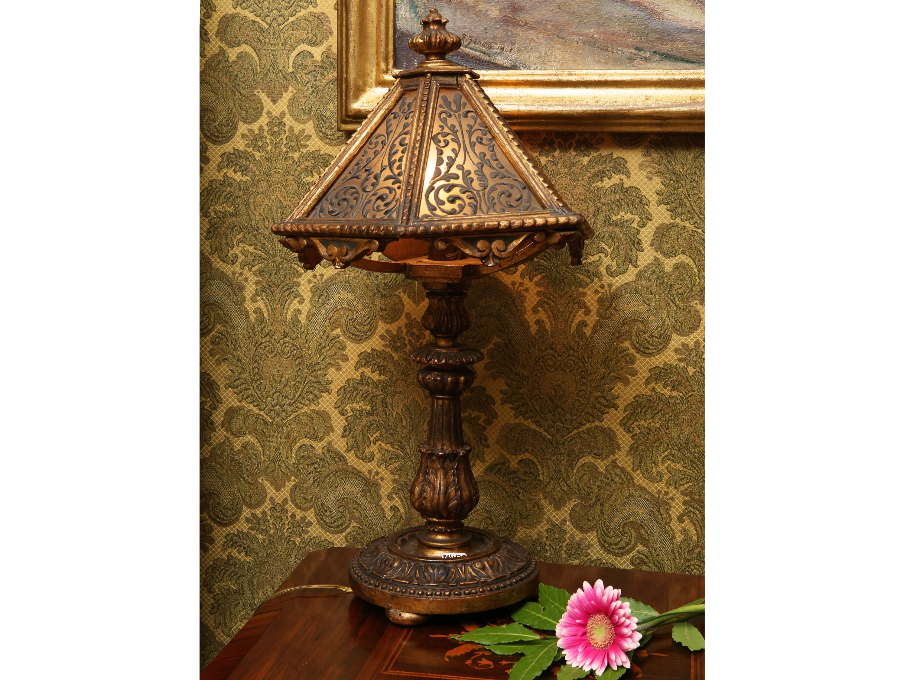 XIX/XX secolo una piccola specchiera a bilico impiallacciata in radica di noce ed un lume in legno intagliato e dorato con cappello realizzato con trapezi in vetro decorato, alcuni difetti