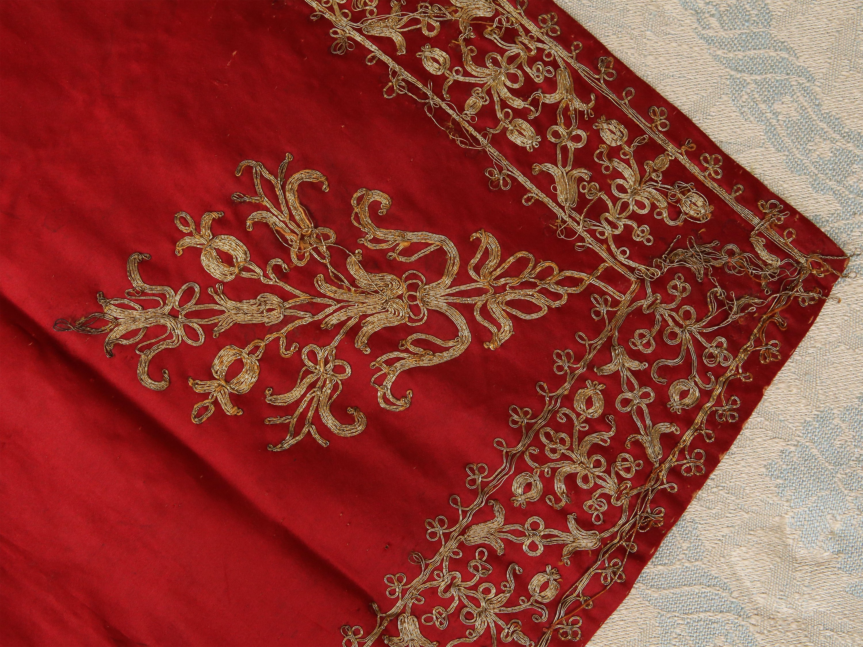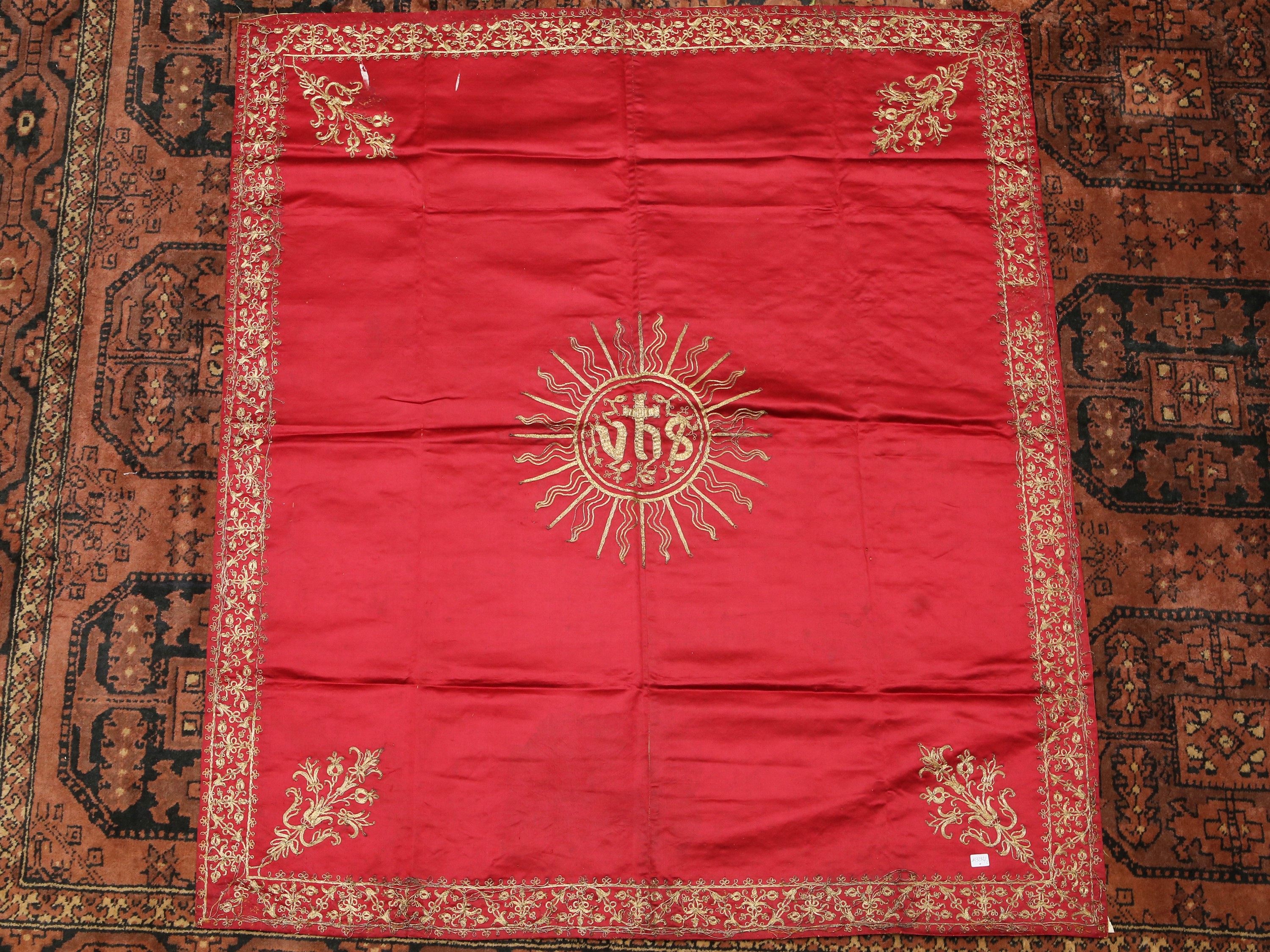 XIX secolo uno da altare in ermisino rosso ricamato in fili dorati, l'altro in seta bianca, ricamato con motivi floreali policromi ed il monogramma AM in fili argentati, quest'ultimo in cornice, difetti