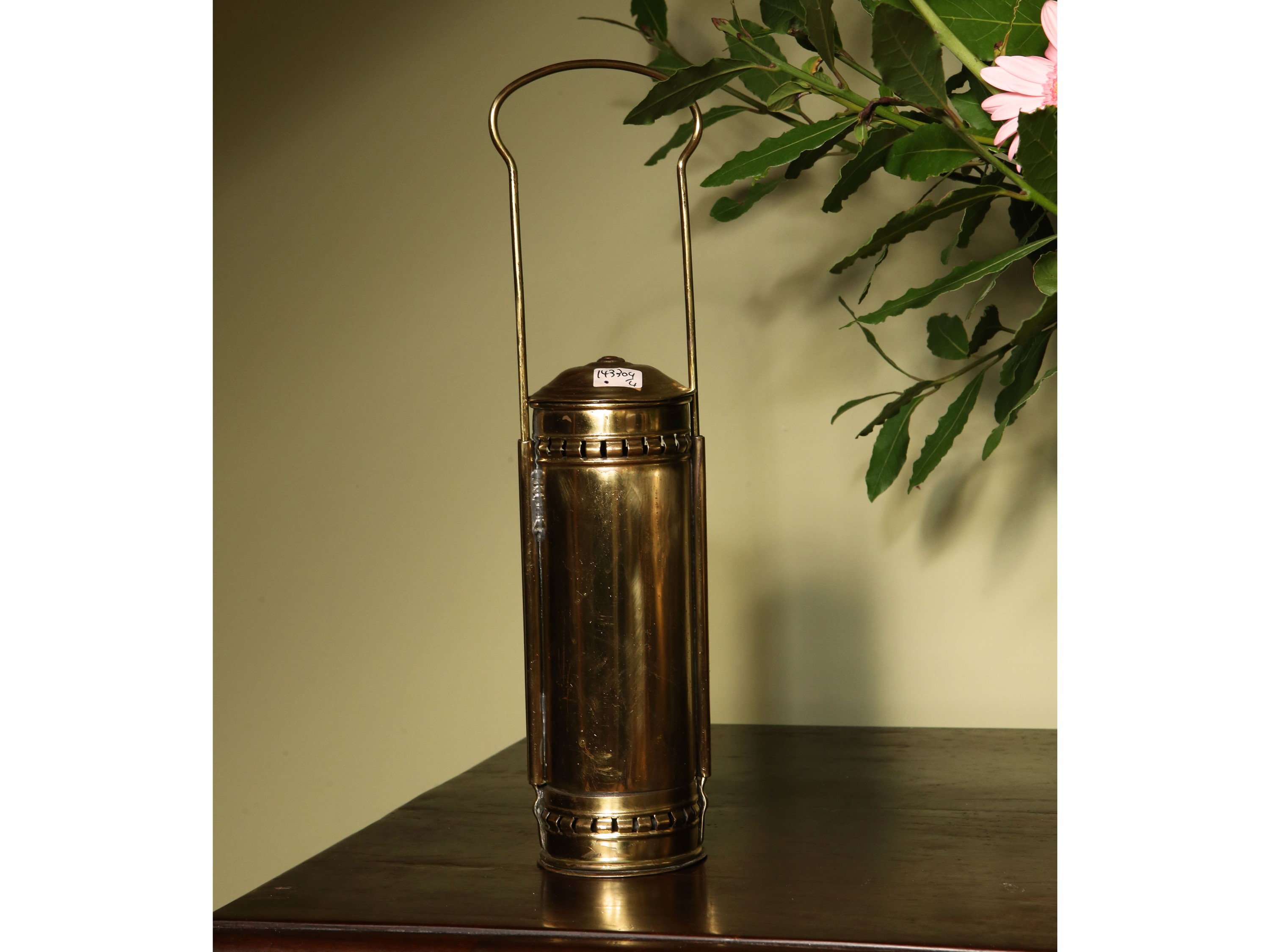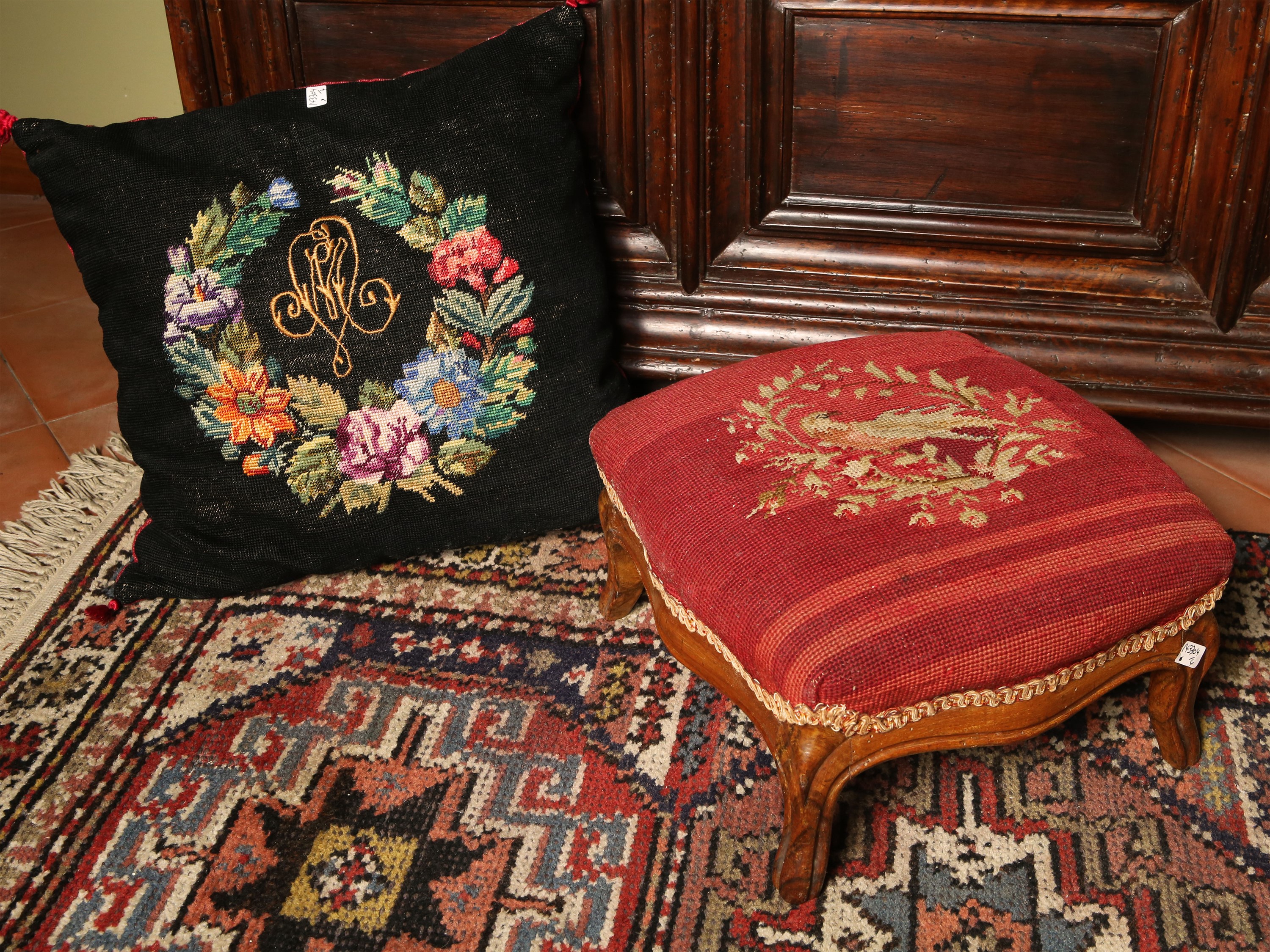 XIX/XX secolo composto da un poggiapiedi in noce ed un cuscino ricamati a piccolo punto, un portavasi ed una lanterna in metallo