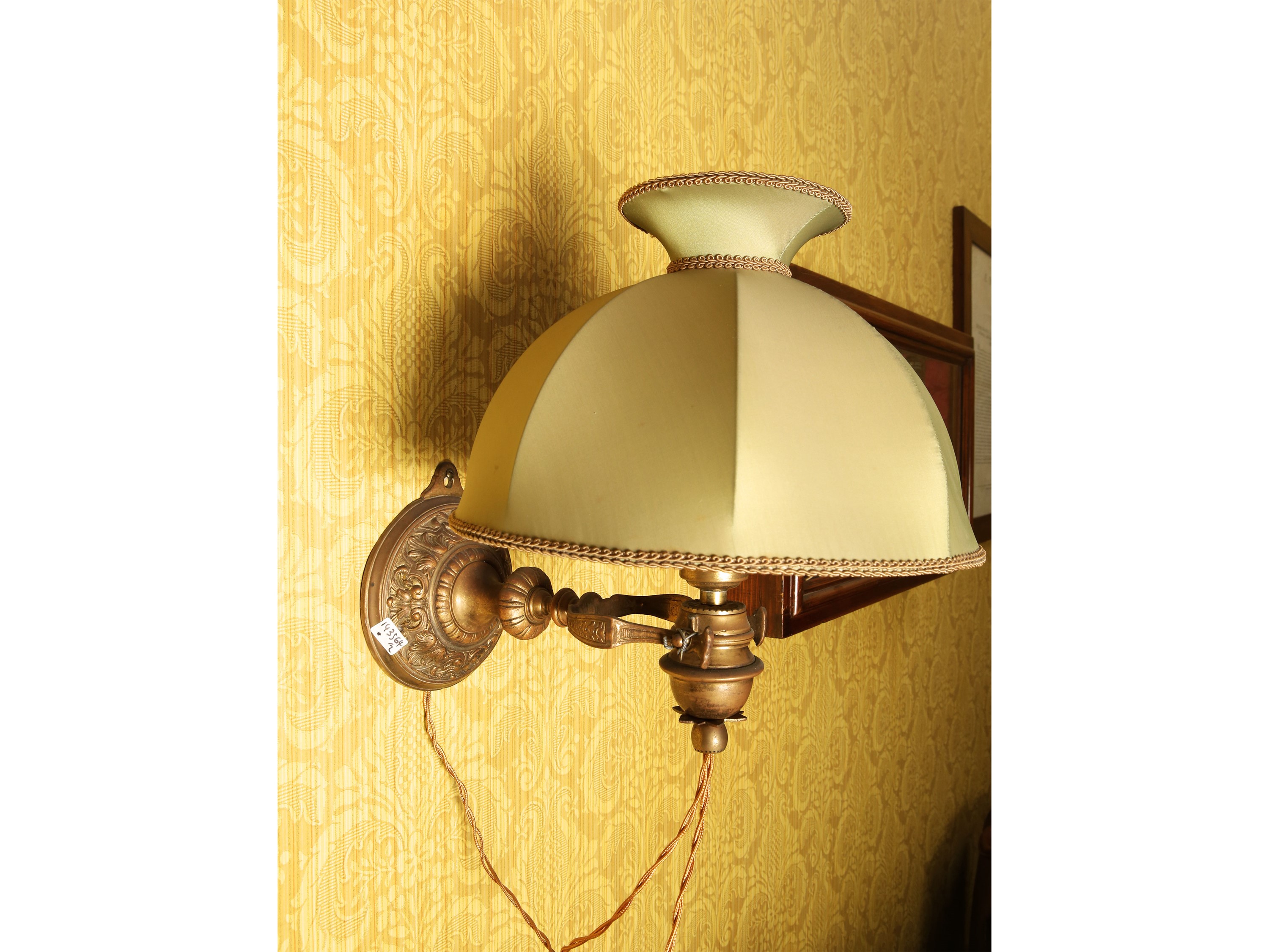 fine del XIX secolo composto da un'applique ad olio in tole, elettrificata, con cappello in seta verde salvia ed una piccola mensola ad angolo intagliata con volute e mascheroni
