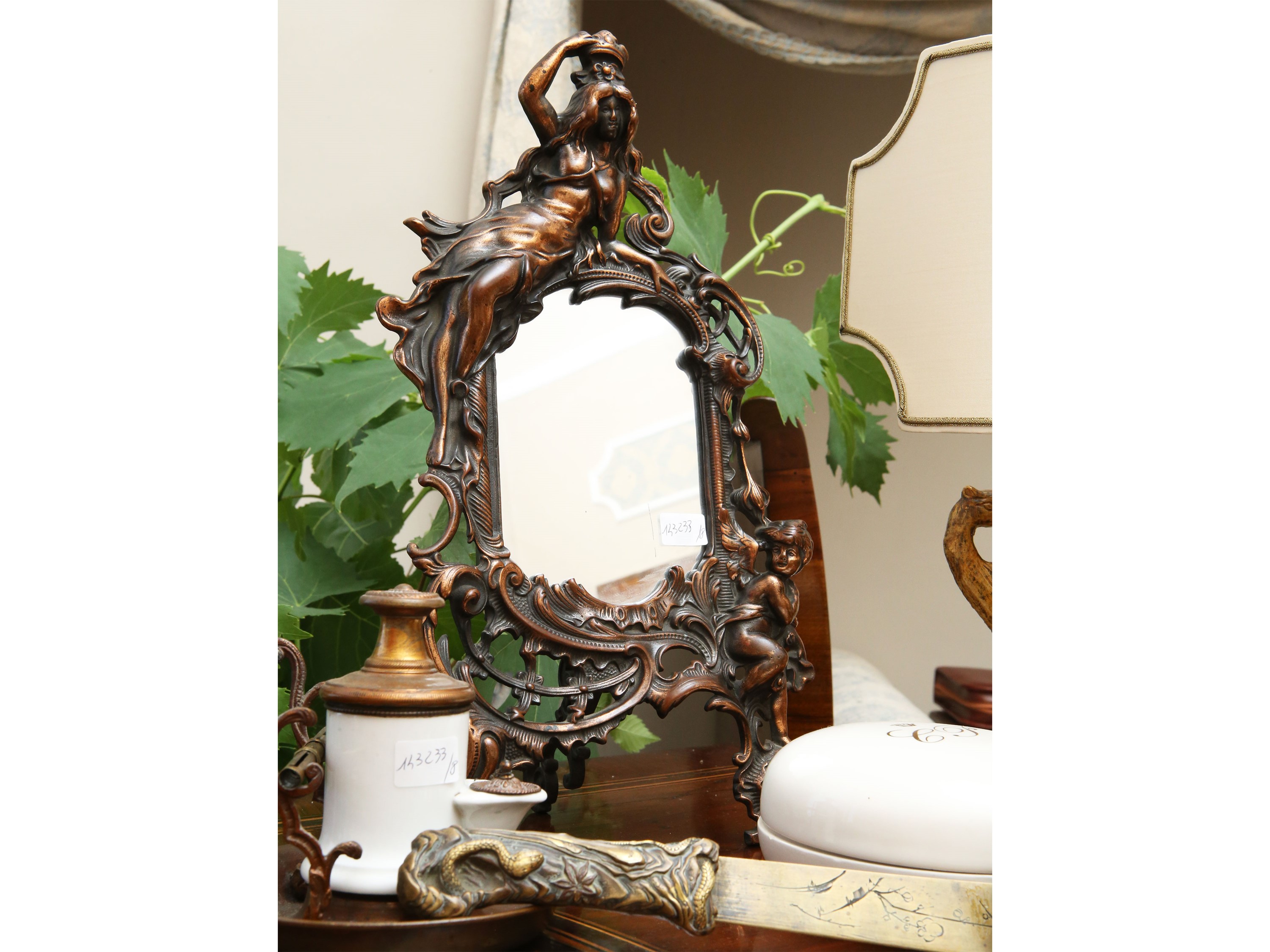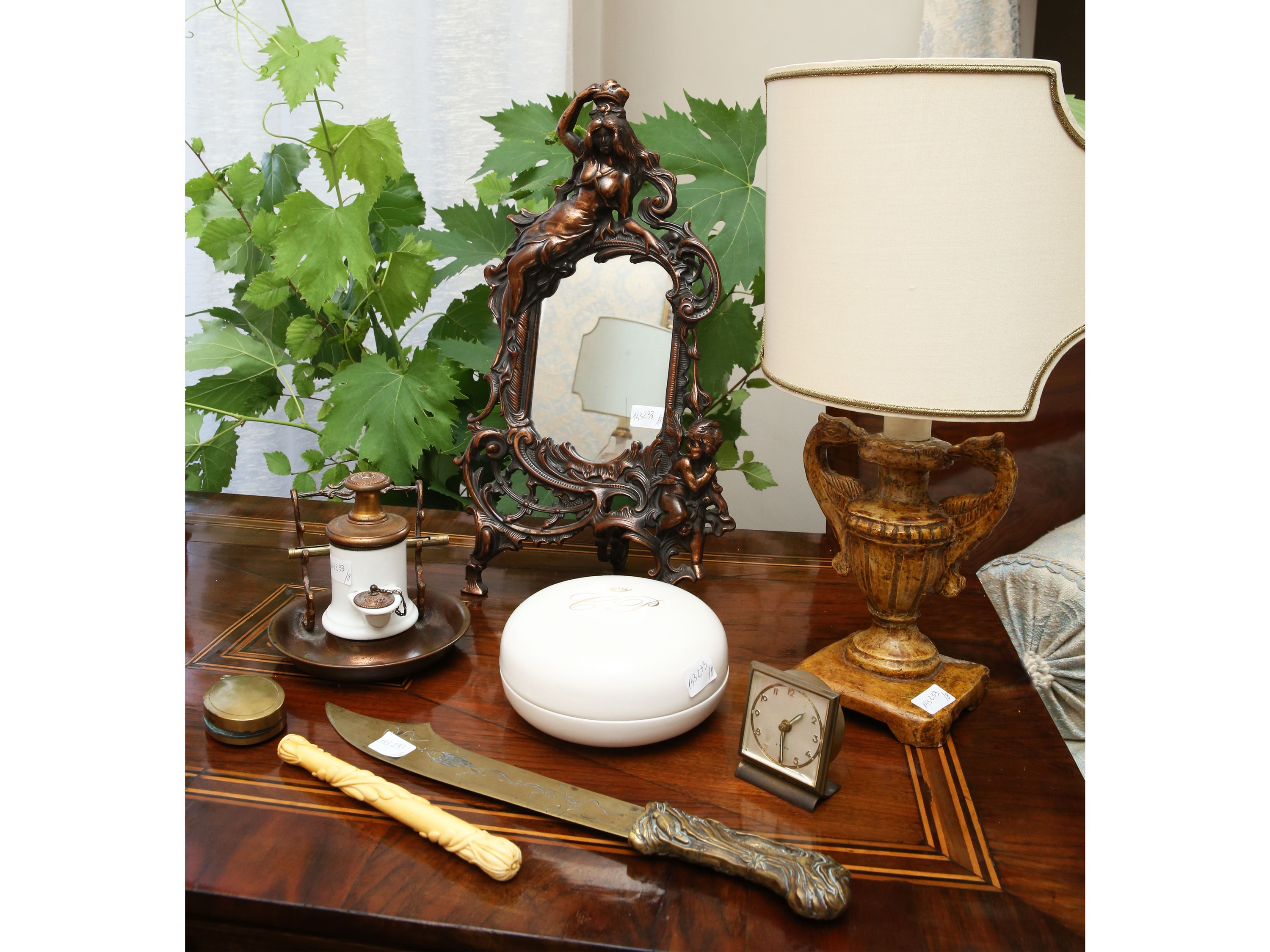 inizio del XX secolo fra cui una specchierina liberty con cornice in metallo, ed un portapalmette montato a lume ed un calamaio in porcellana e metallo
