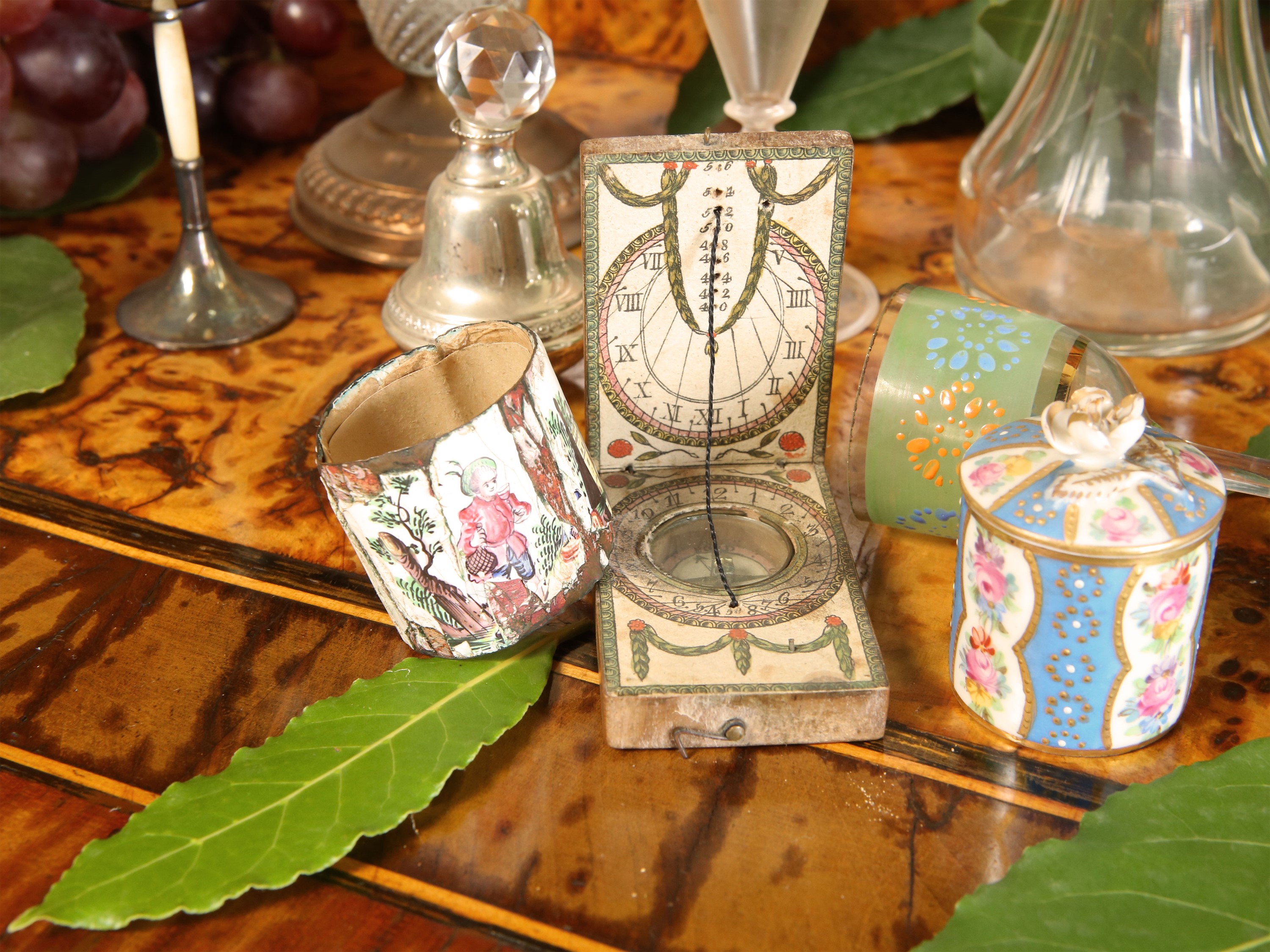 XVIII/XIX secolo tra cui un'antica bussola tascabile rivestita carta dipinta, un frammento di tabacchiera in smalto dipinto con scene galanti ed un set da liquore (17)