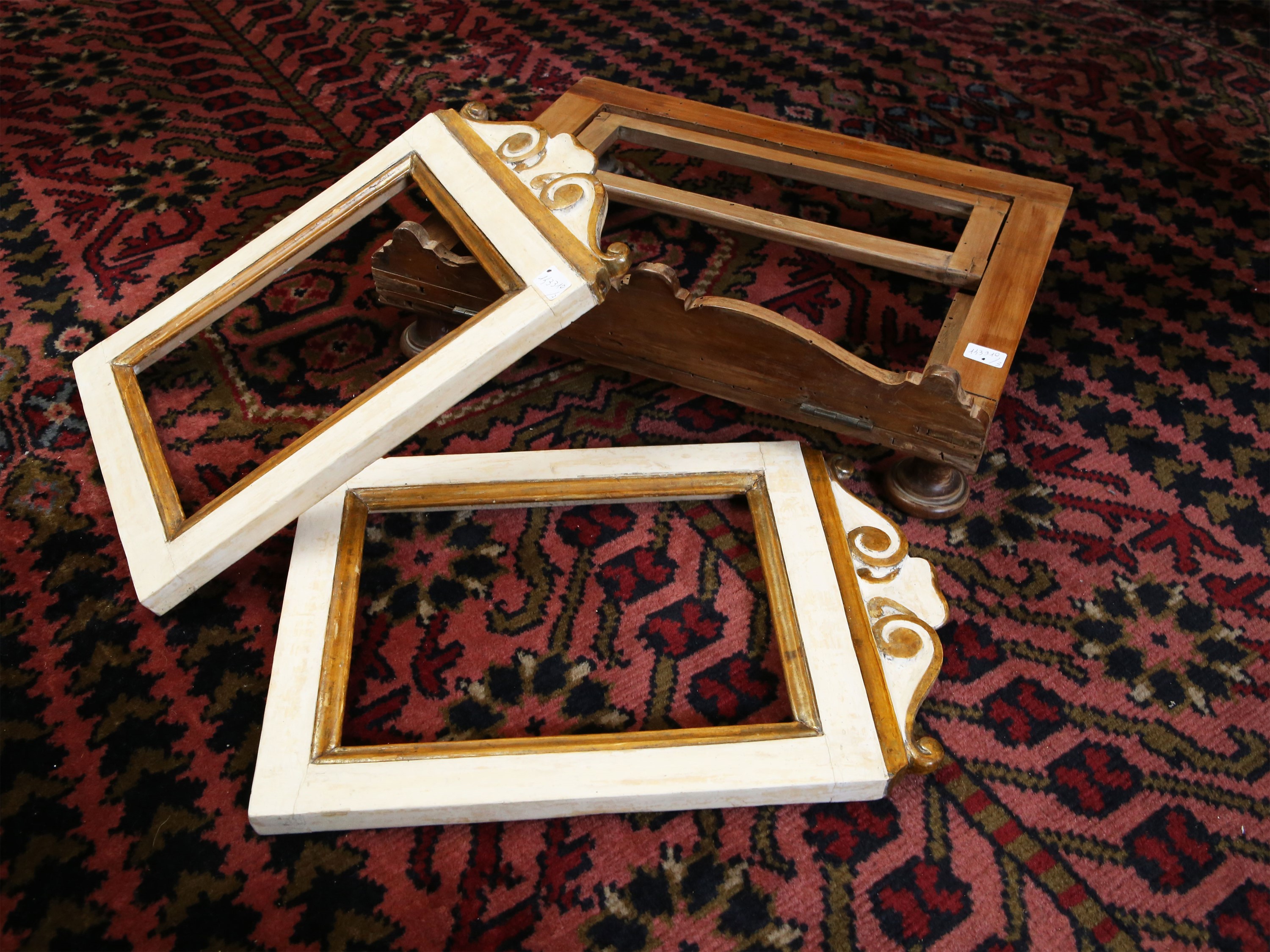 XIX/XX secolo composto da un leggio in ciliegio e due cornici per cartagloria in legno laccato e dorato, lievi difetti