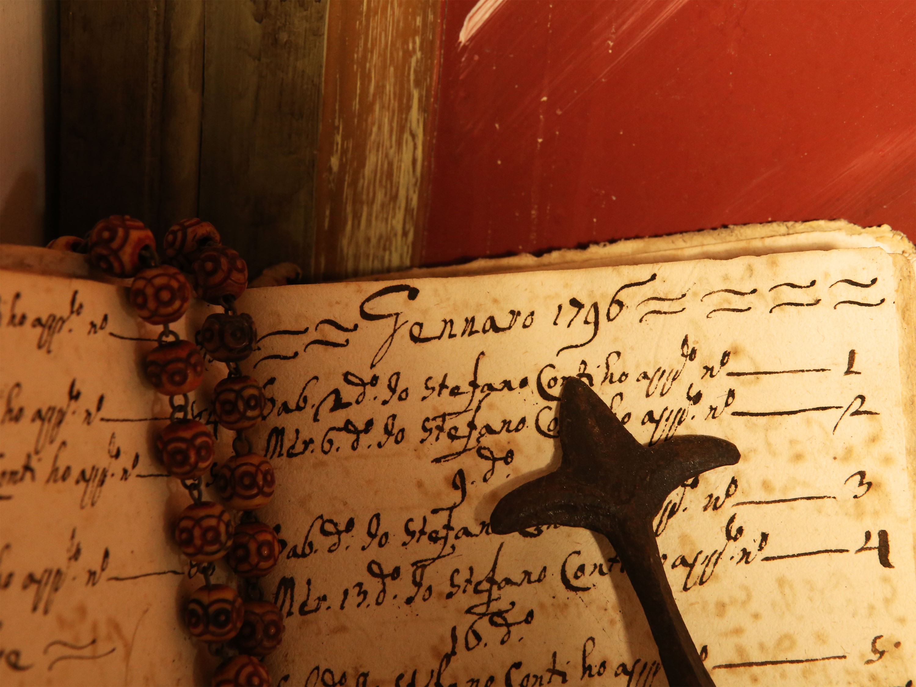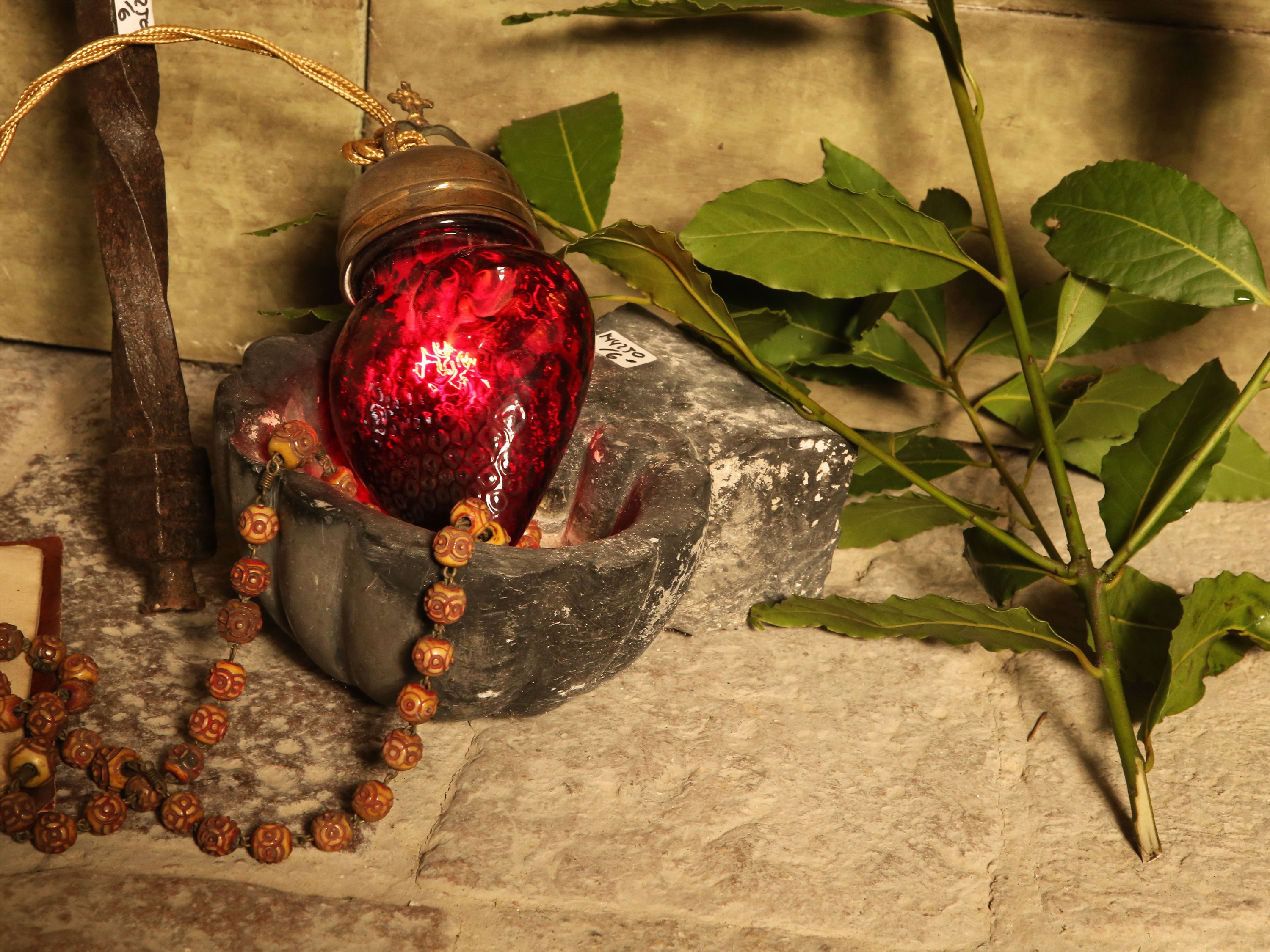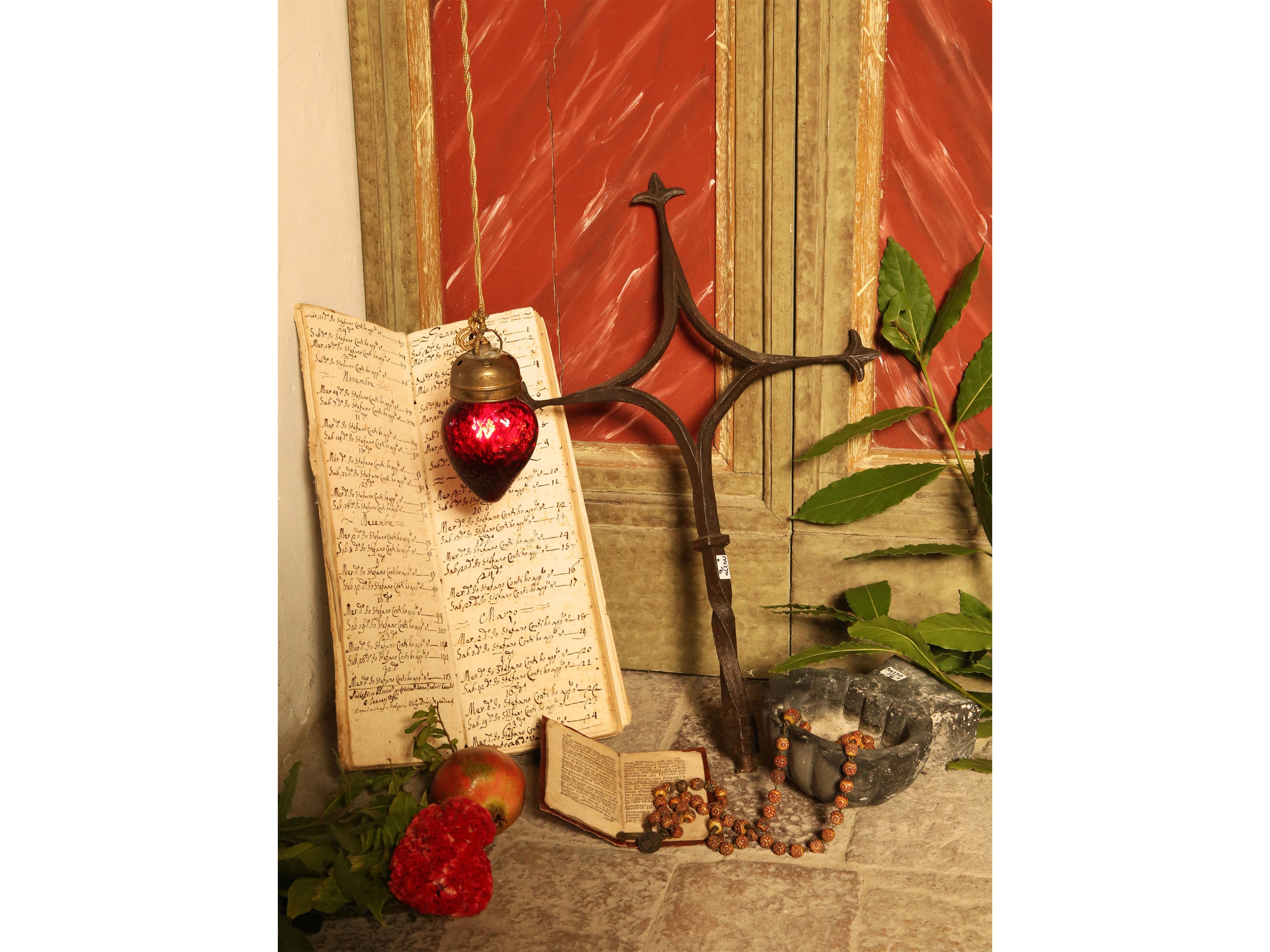 acquasantiera h cm 7x16x18 (6) XVIII/XIX secolo tra cui un'antica acquasantiera in marmo nero, una grande croce in ferro battuto, un registro manoscritto Libro giustificante delle messe celebrate [...] ed una lampada votiva in vetro rosso a foggia di Sacro Cuore, alcuni difetti